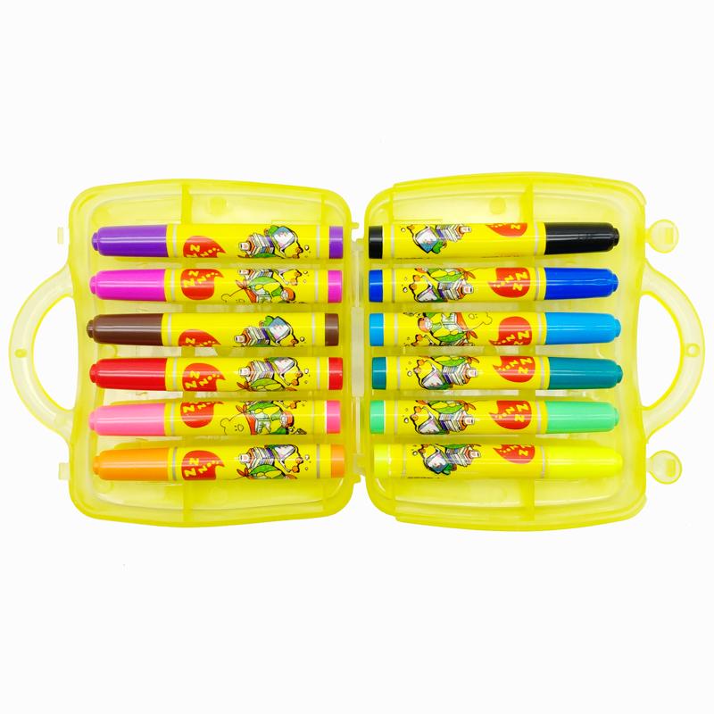 Dạng bút lông tô màu, 12 màu bút được đựng trong vĩ. Màu sắc tươi sáng, rõ nét Đóng gói: 240 vỉ/thùng carton. Lợi ích: Đầu bút bền, độ kín hơi cao, không độc hại