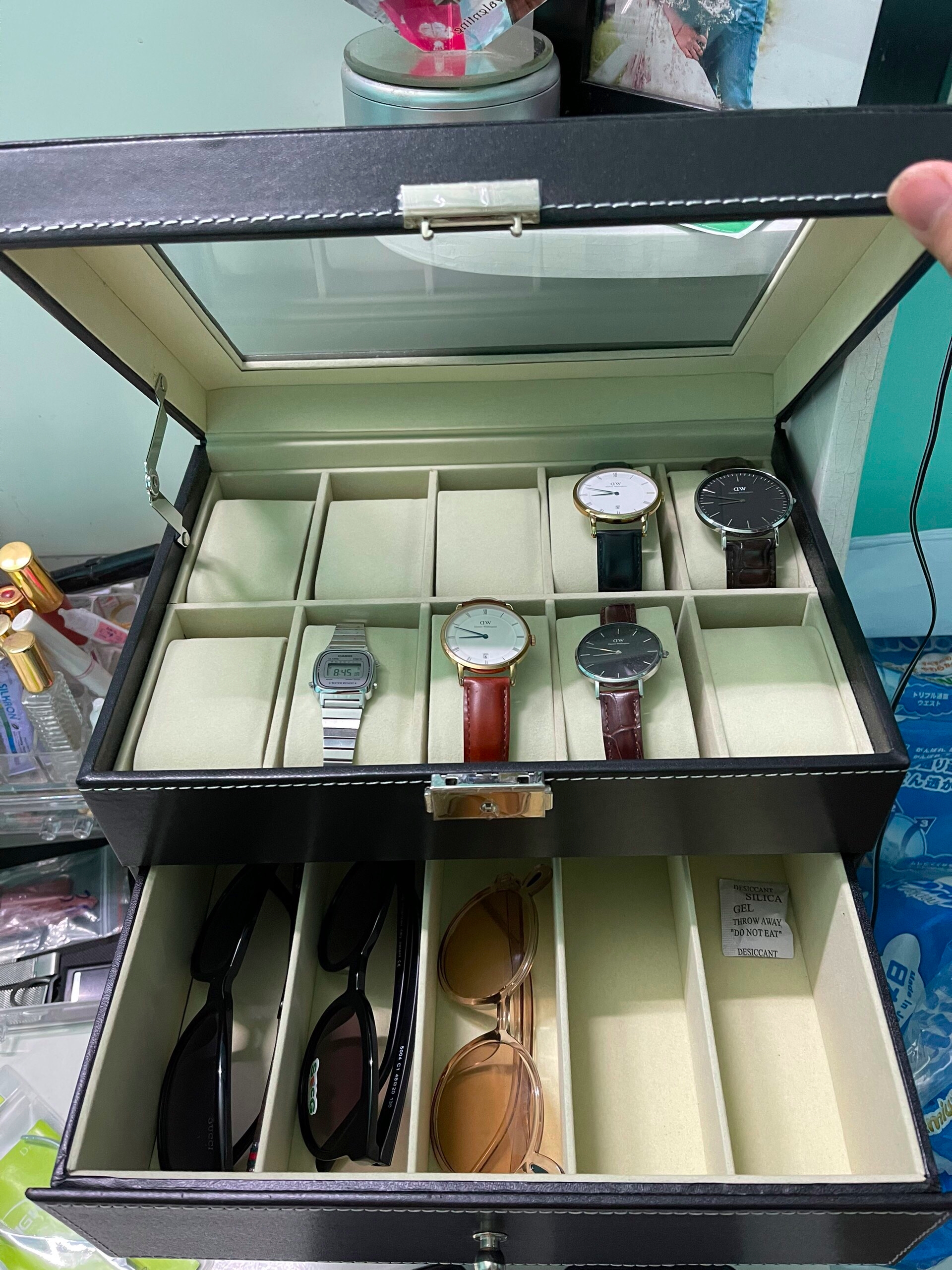 Bạn có khoảng 6-8 chiếc đồng hồ và phụ kiện trang sức như nhẫn, vòng ùng với đó bạn thích hộp có mặt kính để nhìn thấy phụ kiện bên trong hộp và hộp có