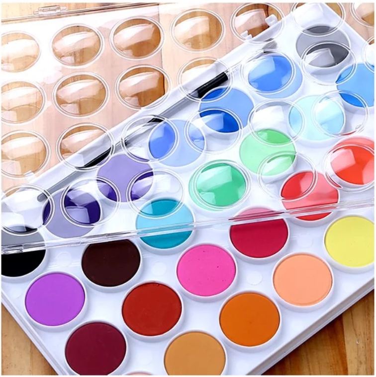 Bánh màu được đóng trong khay chữ nhật trong suốt gọn gàng cùng kèm theo cọ và khay đựng cọ giúp bạn dễ dàng mang màu theo