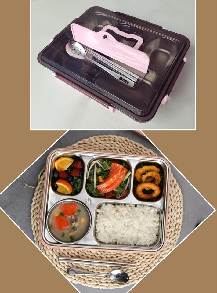-Hộp có chia ngăn, bạn có thể để riêng thức ăn và cơm mỗi loại 1 ngăn. Đặc Biệt có ngăn chứa canh , giá đỡ điện thoại vừa giải trí vừa thưởng thức bữa ăn ngon