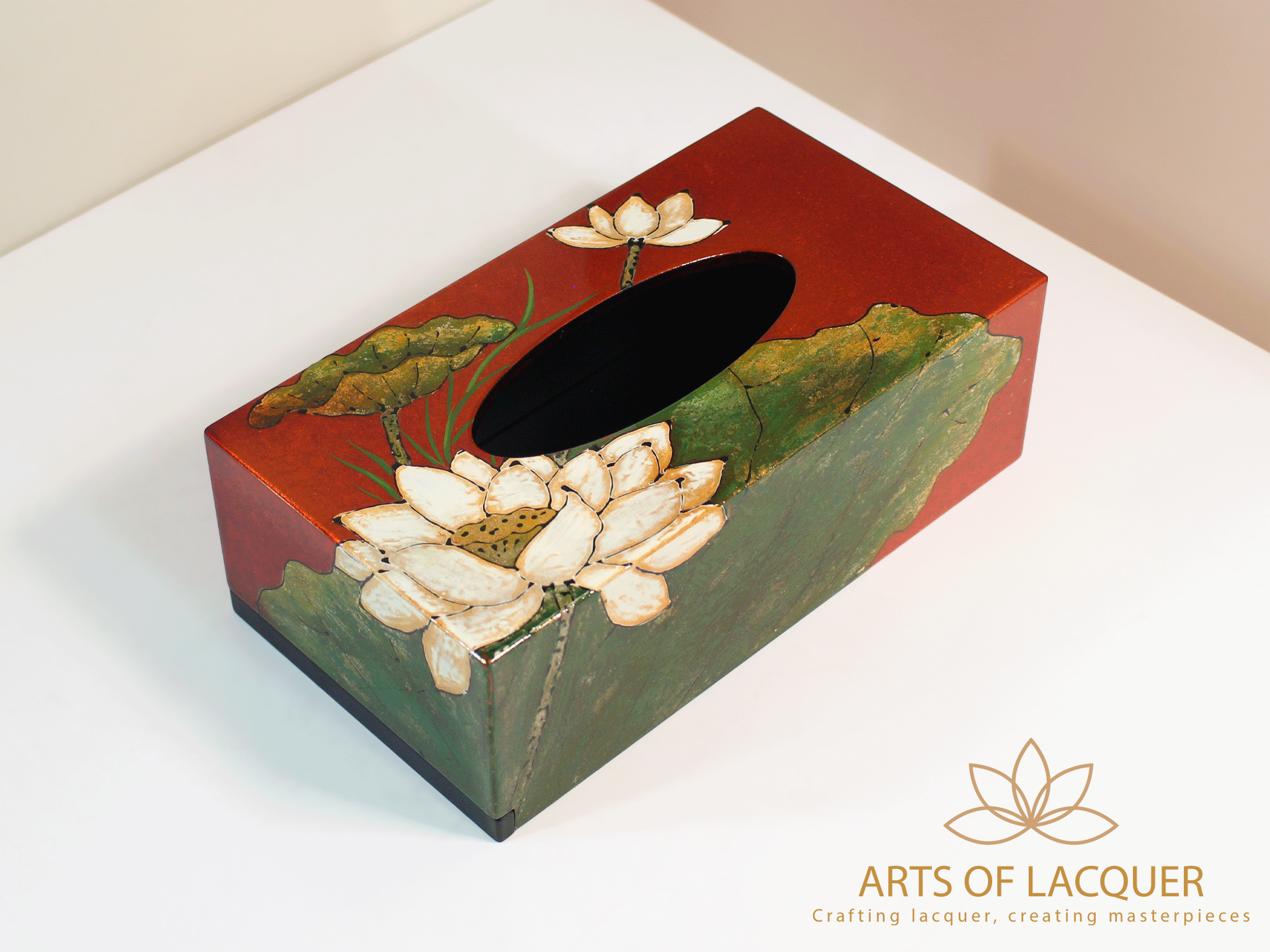 Hộp đựng khăn giấy trong hình là "Hộp Đựng Khăn Giấy Sơn Mài Hoa Sen" từ Arts of Lacquer. Hộp có nền màu đỏ với họa tiết lá sen và hoa sen trắng tinh tế. Chất liệu là gỗ sơn mài, đảm bảo độ bền và khả năng chống nước.