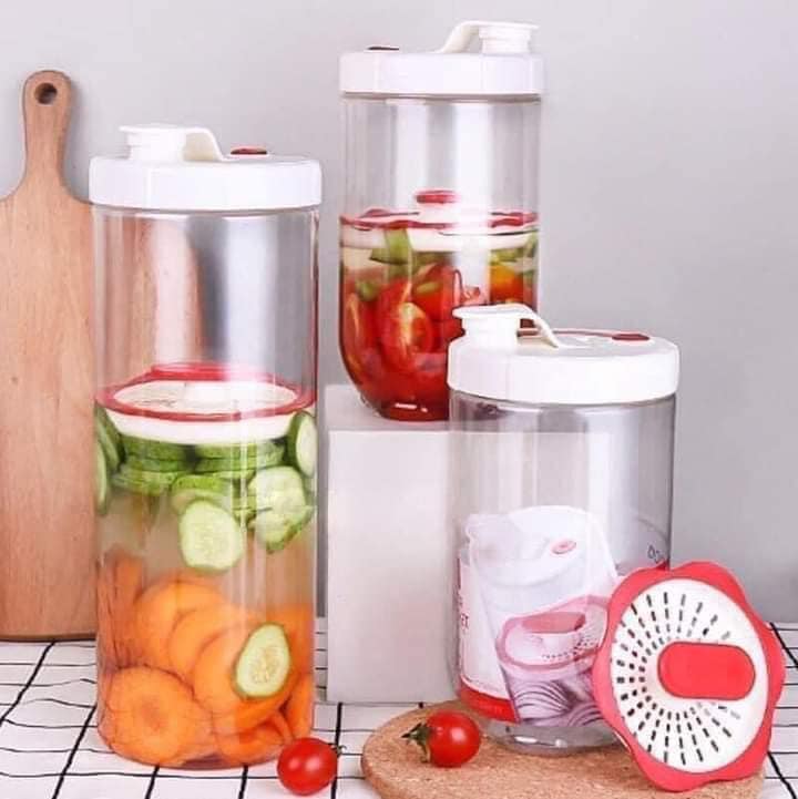 Hộp thiết kế với lớp lưới chèn thực phẩm bên trong giúp việc chèn , ngâm dưa chua , củ kiệu.... được thấm đều , có đầu rót giúp chắt nước ra dễ dàng.