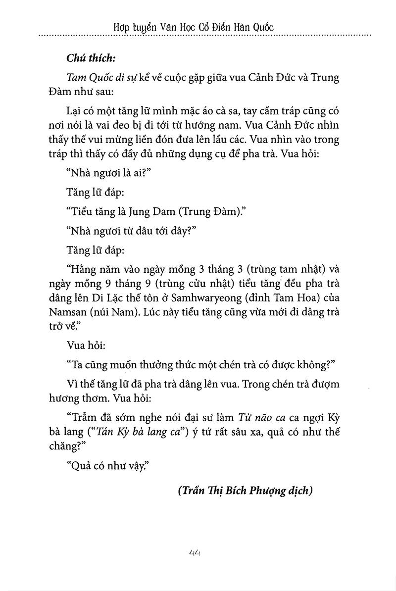 Bộ sách Hợp tuyển văn học Hàn Quốc bao gồm 3 cuốn: (1) Văn học dân gian, (2) Văn học cổ điển, (3) Văn học hiện đại.