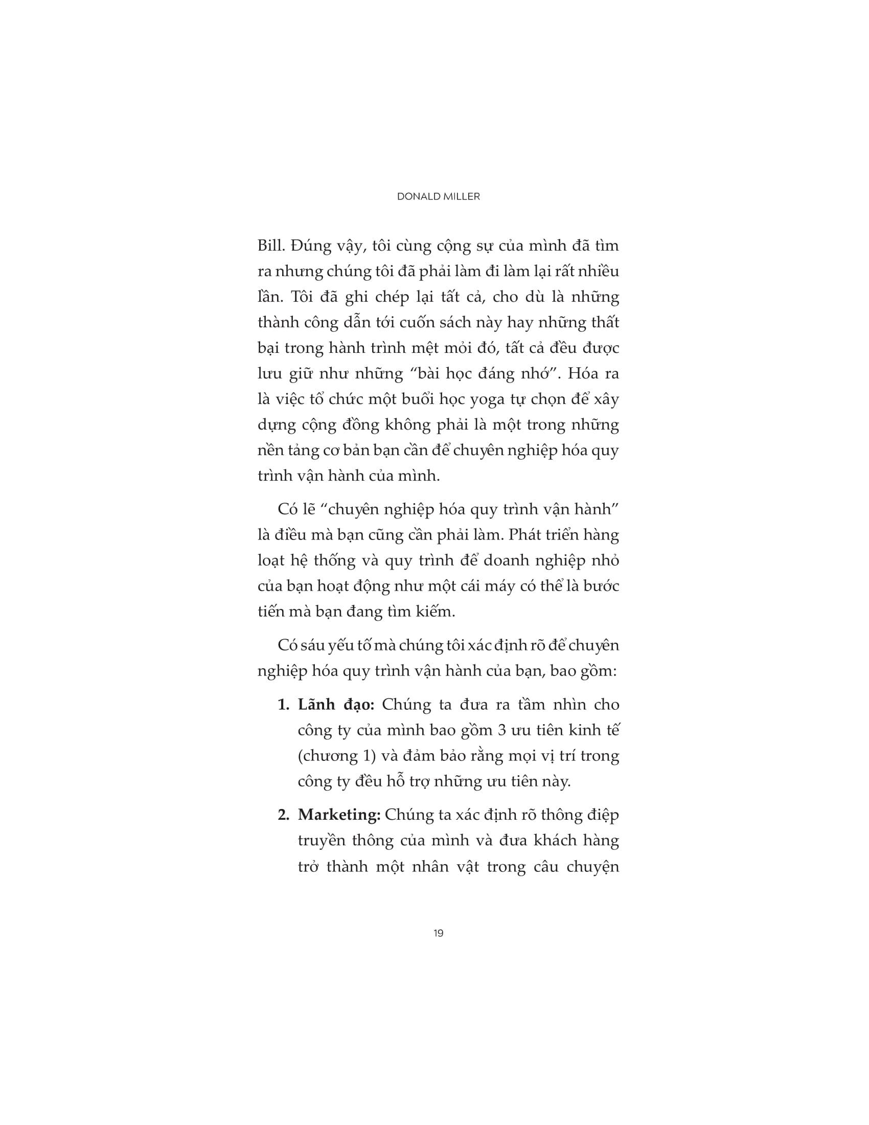 Trong cuốn sách Donald Miller cung cấp cho các doanh nhân một kế hoạch 6 bước để phát triển kinh doanh tạo ra những kết quả khả quan và có thể dự đoán được. Có 6 khung công việc và cẩm nang giúp hàng nghìn chủ doanh nghiệp nhỏ xây dựng nên những mô hình kinh doanh thành công. Nếu bạn cảm thấy việc phát triển doanh nghiệp của m.ình giống như quản lý những mớ hỗn độn, cuốn sách này sẽ giải quyết cho bạn những vấn đề mà bạn đang gặp phải.