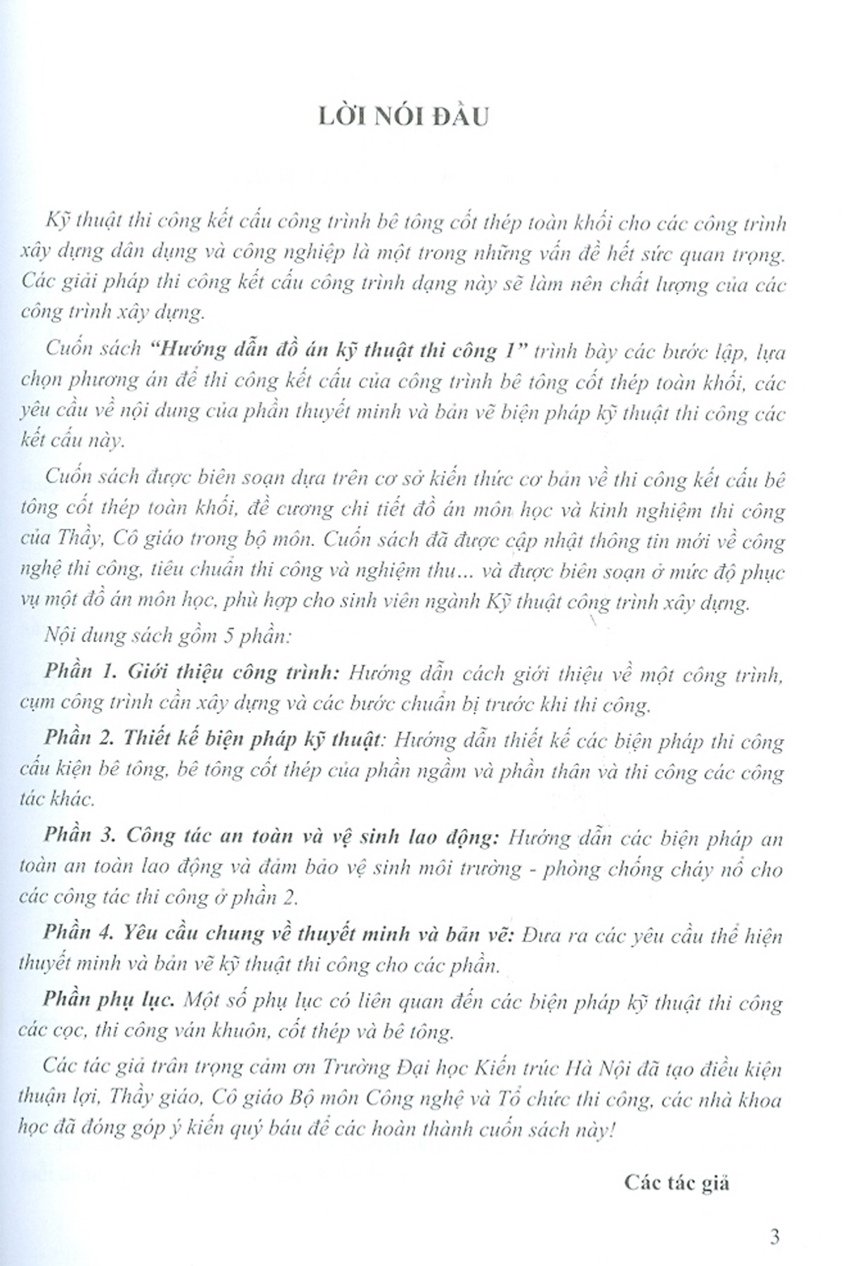 Cuốn sách được biên soạn dựa trên cơ sở kiến thức cơ bản về thi công kết cấu bê tông cốt thép toàn khối, đề cương chi tiết đồ án môn học và kinh nghiệm thi công của Thầy, Cô giáo trong bộ môn. Cuốn sách đã được cập nhật thông tin mới về công nghệ thi công, tiêu chuẩn thi công và nghiệm và được biên soạn ở mức độ phục vụ một đồ án môn học, phù hợp cho sinh viên ngành Kỹ thuật công trình xây dựng.