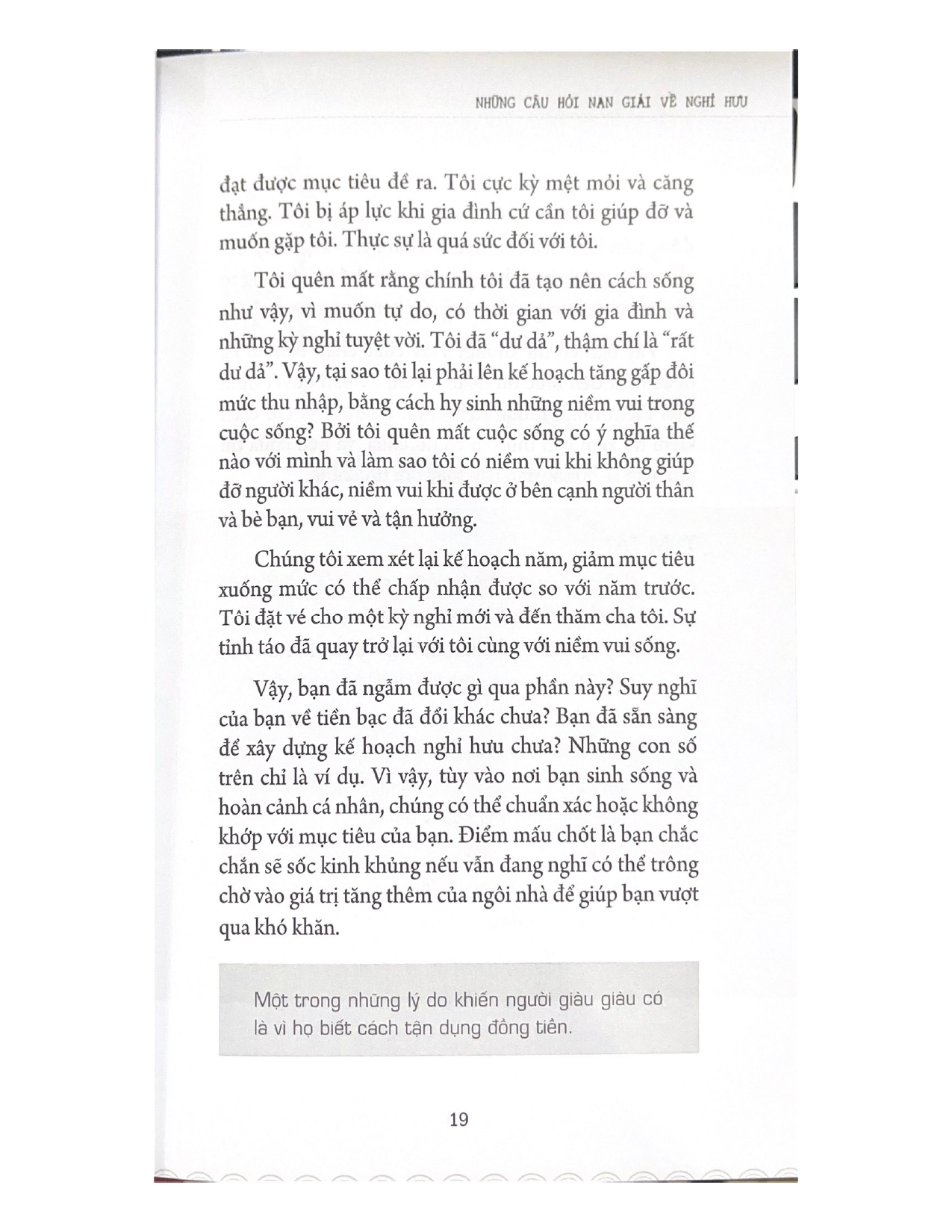 Tất cả chúng ta đều là những cá thể độc nhất và kế hoạch nghỉ hưu của ta cũng vậy. Ta cần phải nghiêm túc nhìn nhận xem tới lúc mình nghỉ hưu hoặc muốn nghỉ hưu thì còn bao lâu nữa. KẾ HOẠCH NGHỈ HƯU SUNG TÚC sẽ xây dựng cho bạn một quá trình tư duy, giúp bạn mường tượng và thậm chí có thể bắt đầu phác thảo chiến lược đầu tư tạo ra nguồn thu nhập và số vốn cần để bước tiếp. Những hiểu biết, nhận thức thu được sẽ giúp ta xác định được mức thu nhập đủ trang trải cho kế hoạch nghỉ hưu trong mơ.