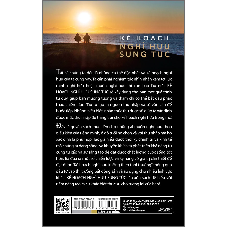 Đây là quyển sách thực tiễn cho những ai muốn nghỉ hưu theo điều kiện của riêng mình, ở độ tuổi họ chọn và với thu nhập mà họ xác định là phù hợp. Tác giả hiểu được thời kỳ chính trị và kinh tế mà chúng ta đang sống, và khuyến khích ta phát triển khả năng tự cung tự cấp và sự sáng tạo để đạt được chất lượng cuộc sống tốt hơn. Bà đưa ra một số chiến lược và kỹ năng có giá trị cần thiết để đạt được “Kế hoạch nghỉ hưu không theo thói thường” thông qua đầu tư vào thị trường bất động sản và áp dụng cho nhiều lĩnh vực khác. KẾ HOẠCH NGHỈ HƯU SUNG TÚC là cuốn sách dễ hiểu với tiềm năng tạo ra sự khác biệt thực sự cho tương lai của bạn!