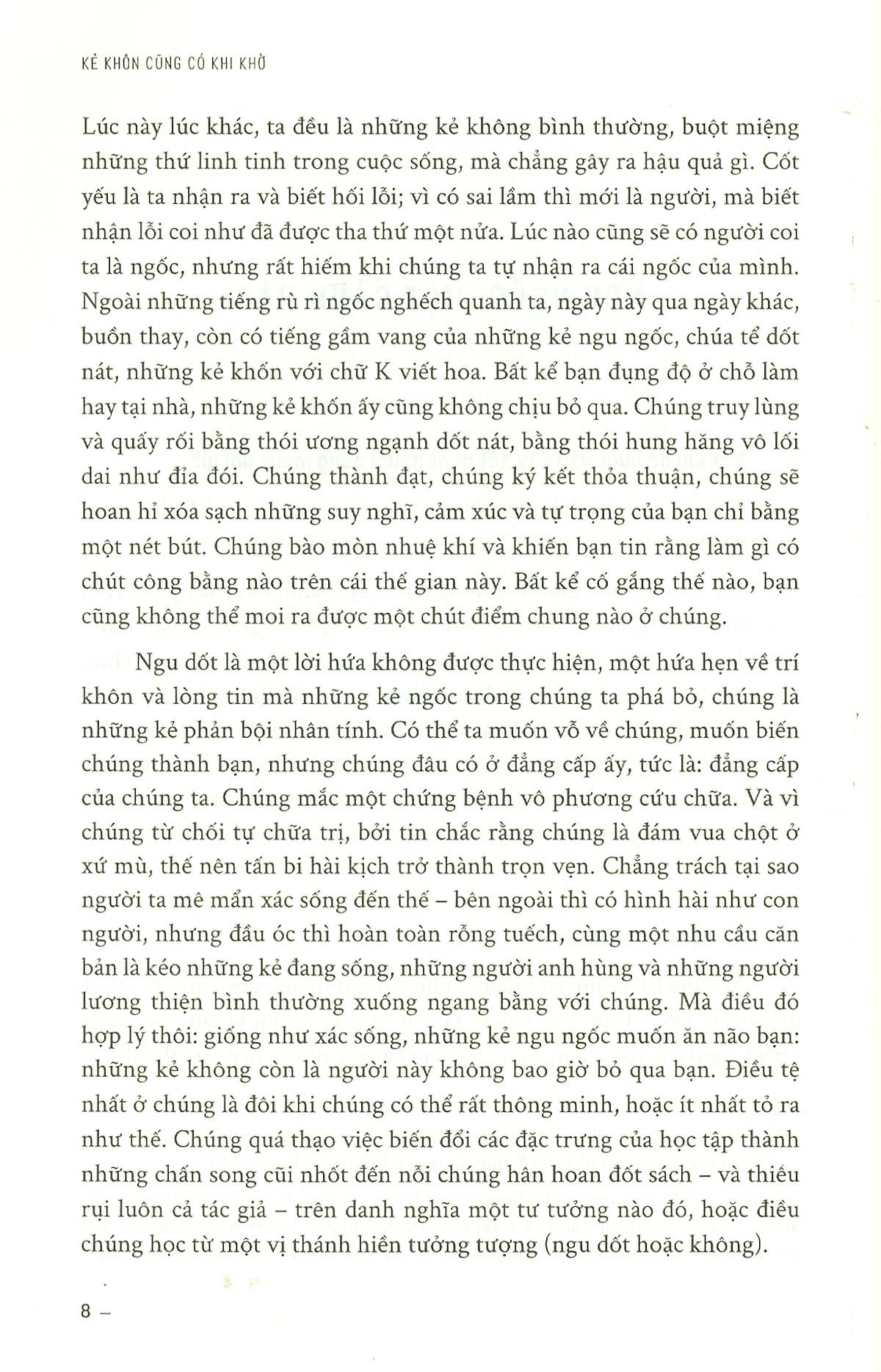 Trong Kẻ khôn cũng có khi khờ, các nhà tâm lý học và nhà tư tưởng hàng đầu – bao gồm người đoạt giải Nobel và các tác giả bán chạy nhất – sẽ cho bạn thấy lý do: tại sao những người thông minh đôi khi lại tin vào những điều hoàn toàn vô nghĩa; bộ não lười biếng của chúng ta khiến chúng ta đưa ra những quyết định sai lầm như thế nào; tại sao cố gắng tranh luận về những kẻ ngu ngốc lại là một cái bẫy; thao túng phương tiện truyền thông và sự kích thích quá mức của Internet khiến chúng ta buồn ngủ như thế nào; tại sao những người ngu ngốc nhất lại không nghĩ rằng họ ngu ngốc. Kẻ khôn cũng có khi khờ kết hợp ý kiến của các chuyên gia về nghiên cứu tâm lý và thần kinh mới nhất với cách tiếp cận trò chuyện đa dạng. CUỐN SÁCH CÓ GÌ ĐẶC BIỆT