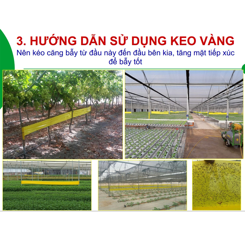 • Tùy loại cây trồng để giăng bẫy keo phù hợp. Theo hướng dẫn của Gadot Israel thì 4m có giăng KEO dính Bẫy và không giăng 4m (giăng 4m – Nghỉ 4m – giăng 4m – Nghỉ 4m)