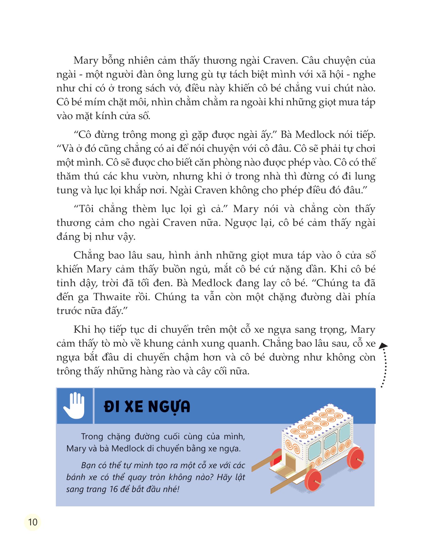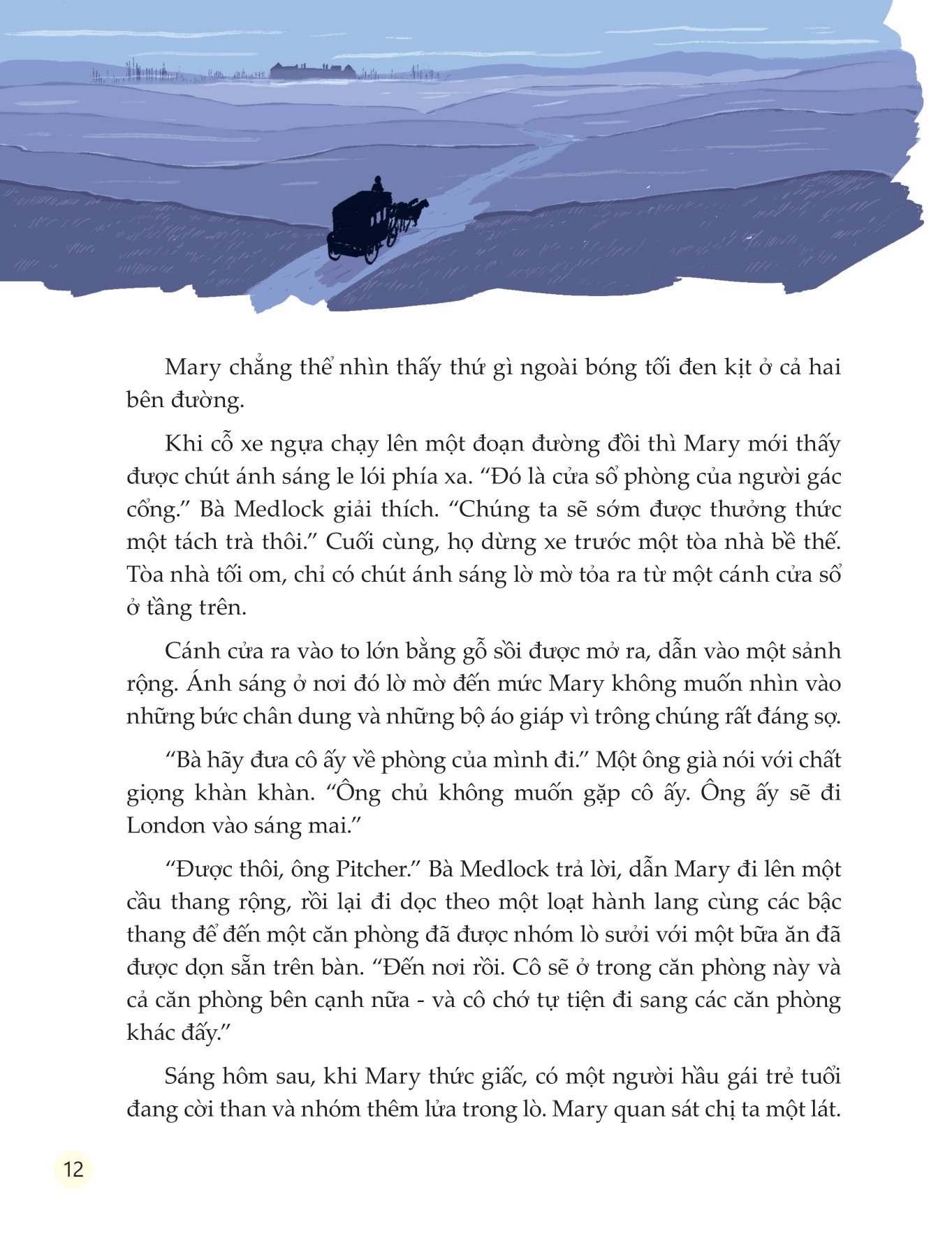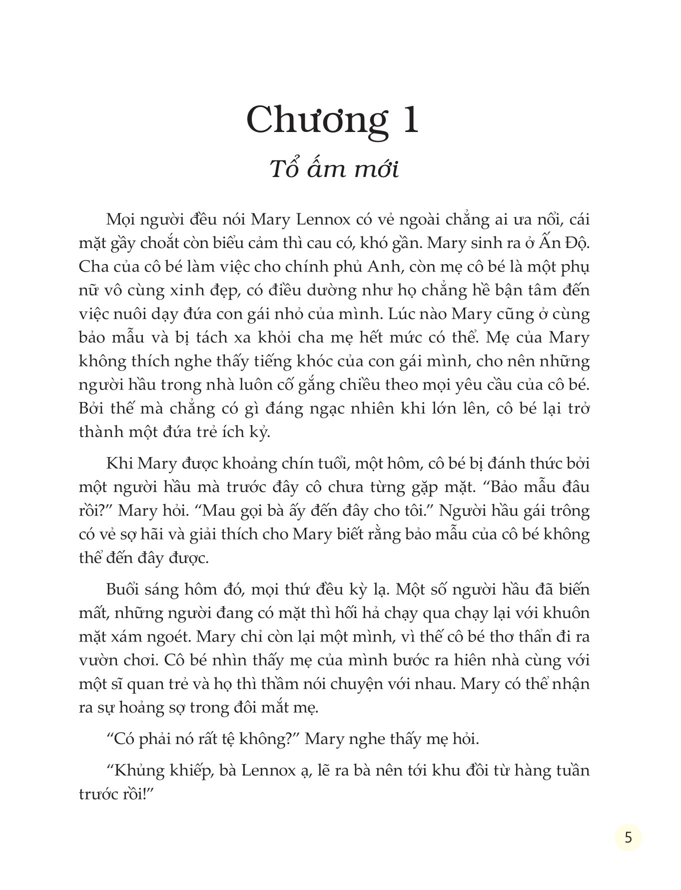 Mọi người đều nói Mary Lennox có vẻ ngoài chẳng ai ưa nổi, cái mặt gầy choắt còn biểu cảm thì cau có, khó gần. Mary sinh ra ở Ấn Độ. Cha của cô bé làm việc cho chính phủ Anh, còn mẹ cô bé là một phụ nữ vô cùng xinh đẹp, có điều dường như họ chẳng hề bận tâm đến việc nuôi dạy đứa con gái nhỏ của mình. Lúc nào Mary cũng ở cùng bảo mẫu và bị tách xa khỏi cha mẹ hết mức có thể. Mẹ của Mary không thích nghe thấy tiếng khóc của con gái mình, cho nên những người hầu trong nhà luôn cố gắng chiều theo mọi yêu cầu của cô bé. Bởi thế mà chẳng có gì đáng ngạc nhiên khi lớn lên, cô bé lại trở thành một đứa trẻ ích kỷ.