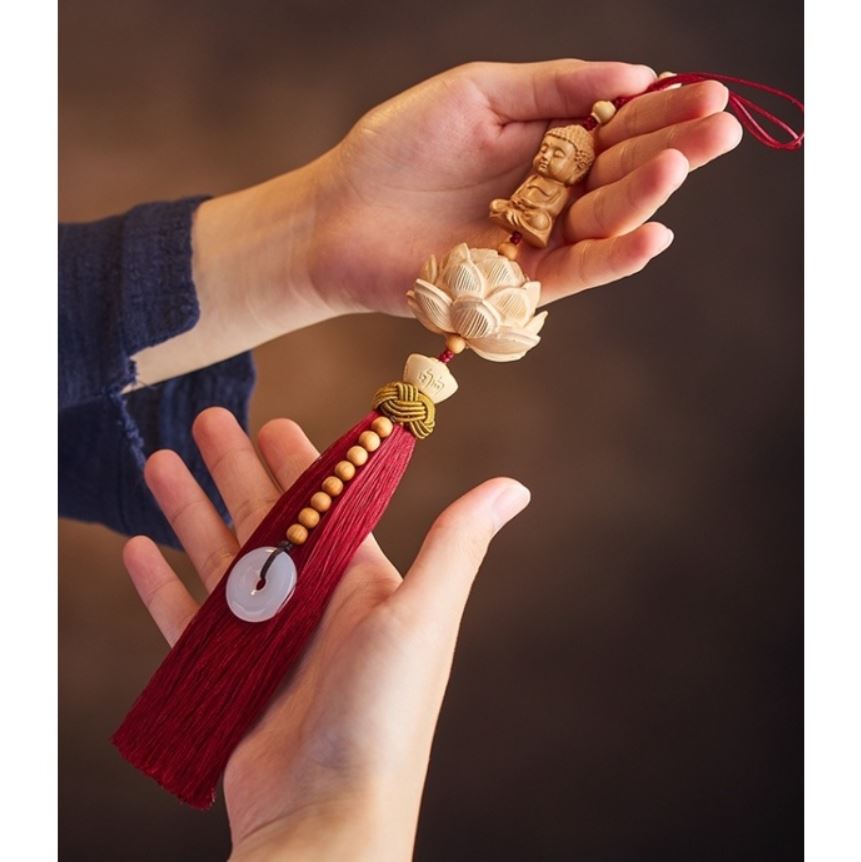 Sự kết hợp chặt chẻ của các biểu tượng CÁT TƯỜNG. Ngoài hình tượng hoa sen TÂM AN , dây còn kết hợp cùng hạt đèn lồng , chữ phúc trong ô vuông gỗ hồng " HỒNG PHÚC " , bên dưới hoa sen là hũ nguyên bảo kết hợp với hạt gỗ tuyết tùng đỏ ( còn gọi là gỗ nhai bách ) nối đồng điếu mang TÀI LỘC.