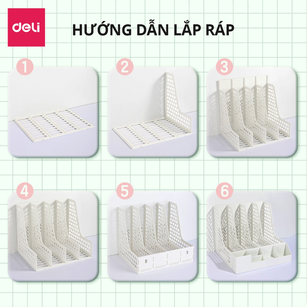 TÍNH NĂNG SẢN PHẨM ️Chất liệu nhựa PP chắc chắn, siêu bền, đảm bảo lưu trữ tài liệu ️Dễ dàng sử dụng, lưu trữ tài liệu ️Thiết kế mở, tránh bụi, nhiều lỗ nhỏ giúp đứng vững hơn ️Thiết kế với đa mục đích, có thể sử dụng đỡ giá sách, cắm bút và đồ dùng học tập THÔNG TIN SẢN PHẨM: Tên sản phẩm: Set giá tài liệu 4 ngăn kèm ống bút Deli Mã sản phẩm: PB106 Màu sắc: Xanh lá/ Hồng/ Trắng Xuất xứ: Trung Quốc