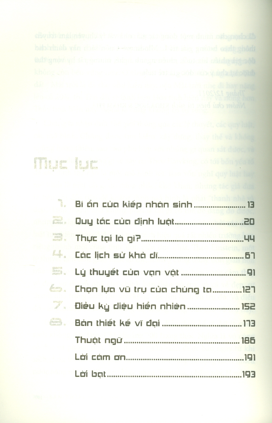 Nội dung cuốn sách, như tác giả nói ngay từ dòng đầu tiên của chương một, là chuyện "Bí ẩn của kiếp nhân sinh", là những câu hỏi tối hậu về sự sống, vũ trụ và vạn vật: Tại sao phải có cái gì đó chứ không phải là hư không?, Tại sao chúng ta tồn tại?, Tại sao là tập hợp các định luật vật lý cụ thể này chứ không phải các tập hợp khác?