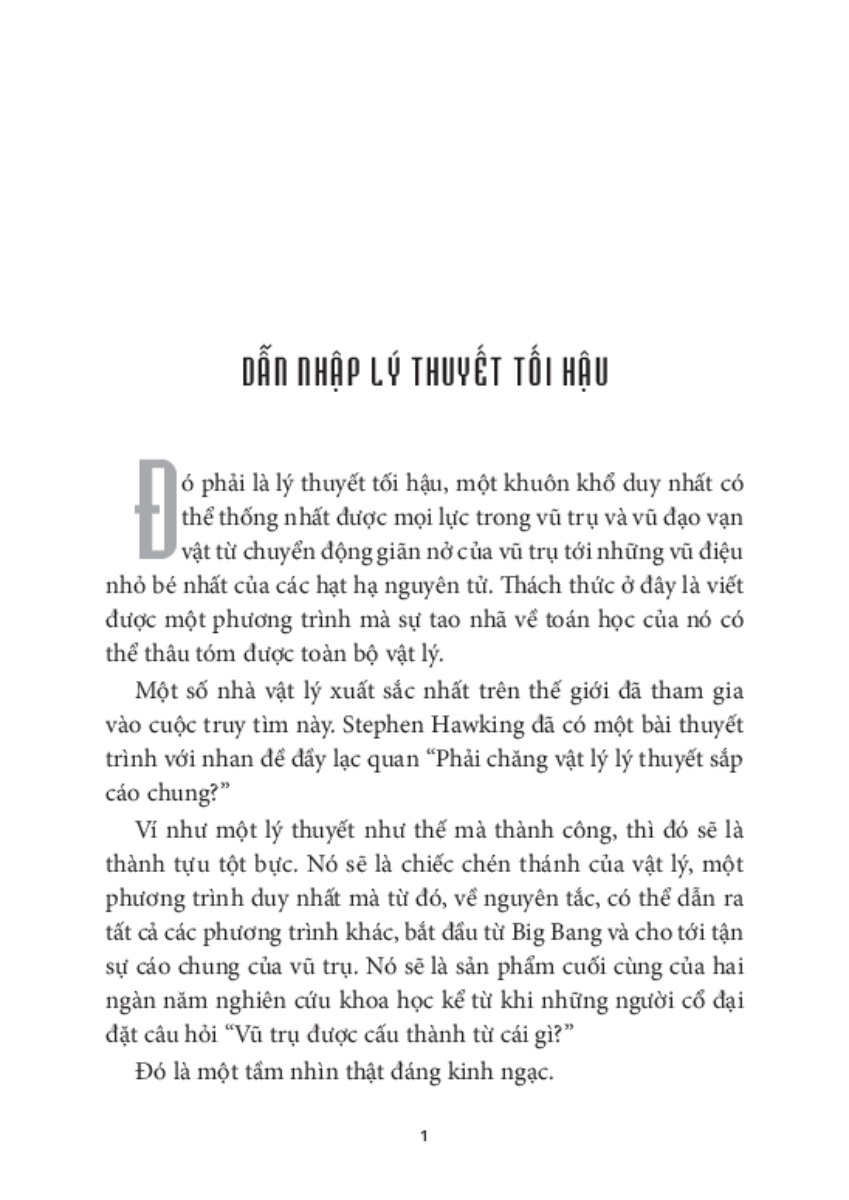 Một cuốn sách xuất sắc được viết bởi một nhà truyền thông khoa học bậc thầy. Nếu ai đó có thể làm sáng tỏ những điều thâm thúy của toán học và lý thuyết dây, thì đó chính là Michio Kaku. Trong cuốn sách nhỏ tuyệt vời này, tác giả giải thích bằng những thuật ngữ rõ ràng và đơn giản những đột phá về khái niệm và những câu hỏi chưa được giải đáp - trong việc tìm kiếm một lý thuyết thống nhất vĩ đại của vạn vật.