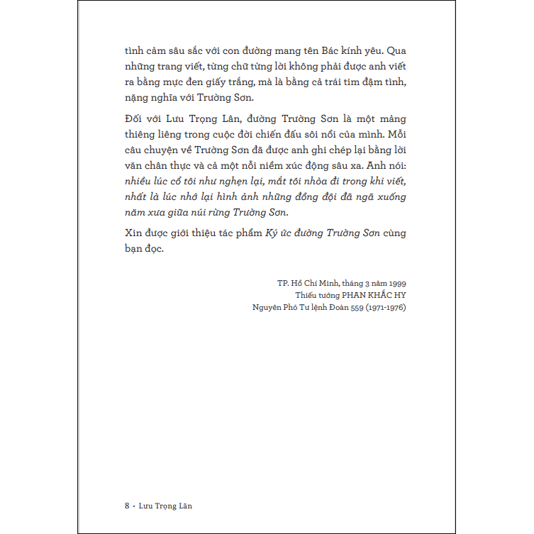 Ký ức đường Trường Sơn là tập bút ký gồm 16 bài, phát họa khá sinh động các bức tranh toàn cảnh con đường huyền thoại trong những năm chiến tranh ác liệt. Có mặt từ vị chính ủy nổi tiếng – Đặng Tính đến cán bộ, chiến sĩ bộ đội phòng không, công binh, lái xe, quân y, thanh niên xung phong, dân quân, tự vệ và quần chúng nhân dân. Mỗi câu chuyện là một kỷ niệm sâu sắc của tác giả, nhưng hết thảy đều lóng lánh khí phách anh hùng và bản chất cao đẹp của những con người ưu tú. Gian khổ, khó khăn vô bờ bến, cuộc đọ sức, sự hy sinh diễn ra từng giờ từng phút… sự tổn thất, mất mát không thể đếm đo… nhưng ở đâu, lúc nào cũng thấy lạc quan, yêu đời, sự thông minh, sáng tạo, tình yêu, tình bạn nồng thắm, tình quân dân đậm đà cá nước.