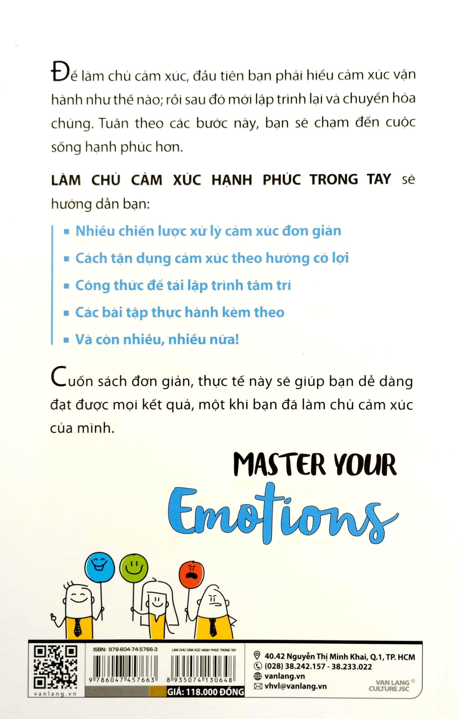 Để làm chủ cảm xúc, đầu tiên bạn phải hiểu cảm xúc vận hành như thế nào; rồi sau đó mới lập trình lại và chuyển hóa chúng. Tuân theo các bước này, bạn sẽ chạm đến cuộc sống hạnh phúc hơn. Làm chủ cảm xúc Hạnh phúc trong tay sẽ hướng dẫn bạn: Nhiều chiến lược xử lý cảm xúc đơn giản Cách tận dụng cảm xúc theo hướng có lợi Công thức để tái lập trình tâm trí Các bài tập thực hành kèm theo Và còn nhiều, nhiều nữa! Cuốn sách đơn giản, thực tế này sẽ giúp bạn dễ dàng đạt được mọi kết quả, một khi bạn đã làm chủ cảm xúc của mình.