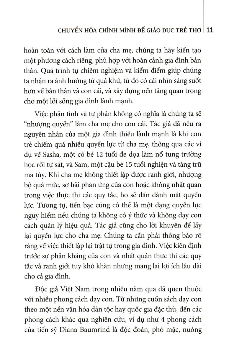 Cuốn sách phân tích sâu sắc về tầm quan trọng của việc cha mẹ tự phản tỉnh và thay đổi để đáp ứng nhu cầu phát triển của con cái. Tác giả khuyến khích sự tự nhìn lại của từng người về tuổi thơ để nhận diện những mặt mạnh và hạn chế trong cách nuôi dạy, từ đó xây dựng mối quan hệ tôn trọng và tin cậy giữa cha mẹ và con cái.