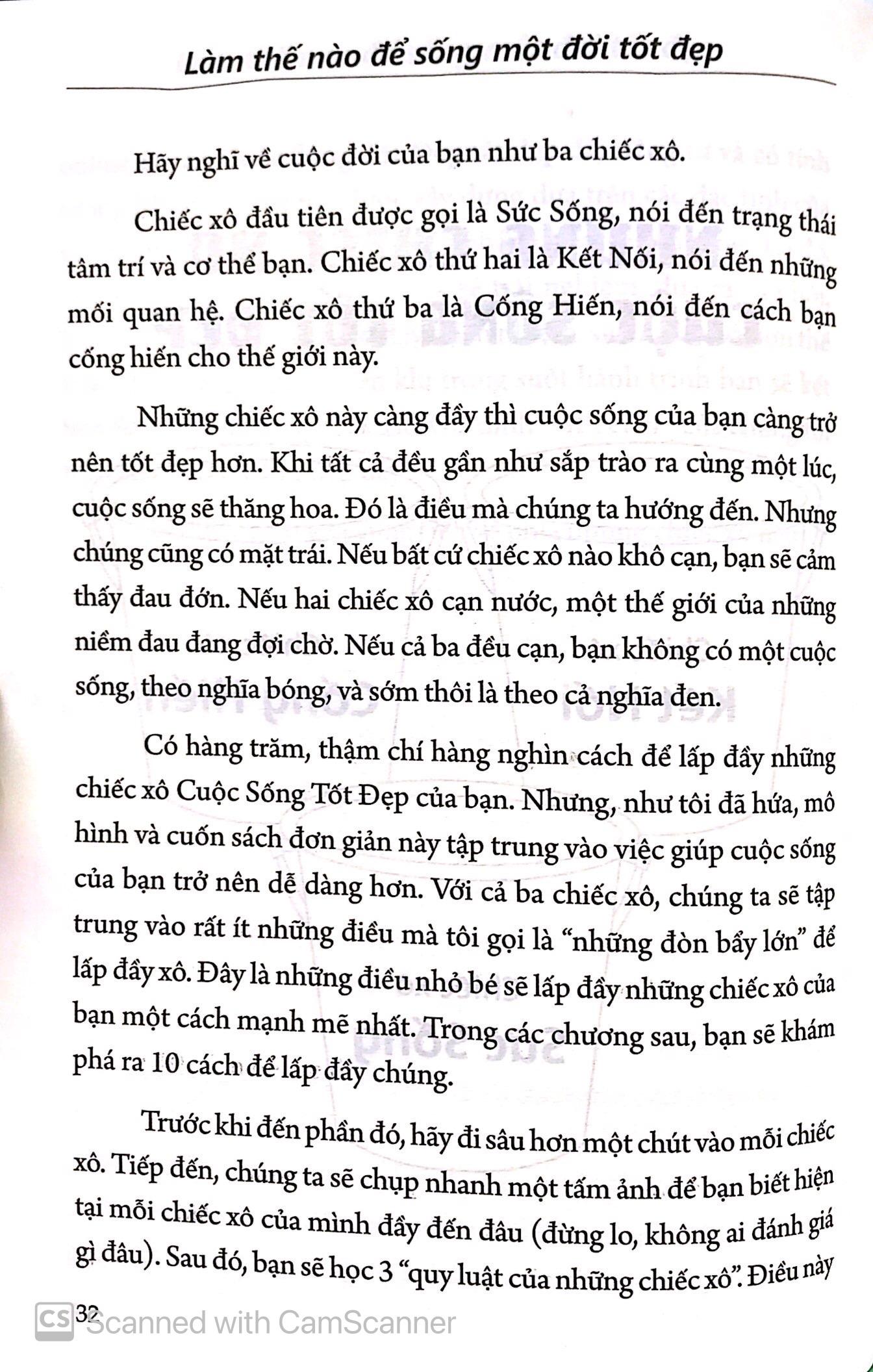 Hãy nghĩ về cuộc đời của bạn như ba chiếc xô. Chiếc xô đầu tiên được gọi là Sức Sống, nói đến trạng thái tâm trí và cơ thể bạn. Chiếc xô thứ hai là Kết Nối, nói đến những mối quan hệ. Chiếc xô thứ ba là Cống Hiến, nói đến cách bạn cống hiến cho thế giới này. Những chiếc xô này càng đầy thì cuộc sống của bạn càng trở nên tốt đẹp hơn. Khi tất cả đều gần như sắp trào ra cùng một lúc, cuộc sống sẽ thăng hoa. Đó là điều mà chúng ta hướng đến.