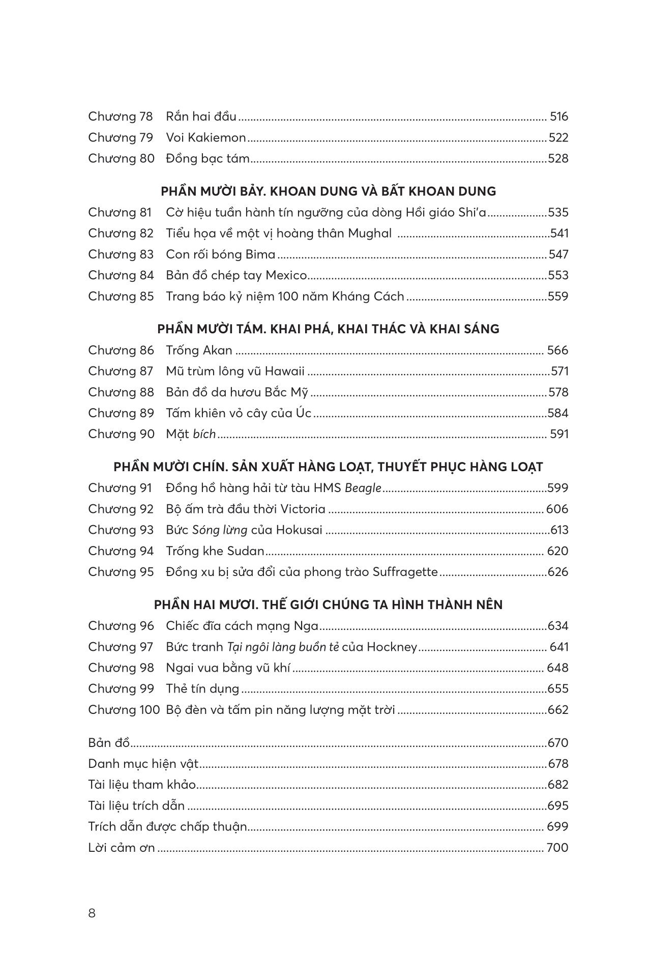 Cuốn sách gồm 20 phần, mỗi phần 5 chương, mỗi chương tương ứng với 1 hiện vật. Vì mỗi tuần có năm số phát sóng, nên sách được trình bày nhóm năm hiện vật lại thành một mục, xoay quanh những địa điểm khác nhau vào cùng thời điểm và quan sát năm lát cắt của thế giới thông qua các hiện vật ở niên đại cụ thể đó.