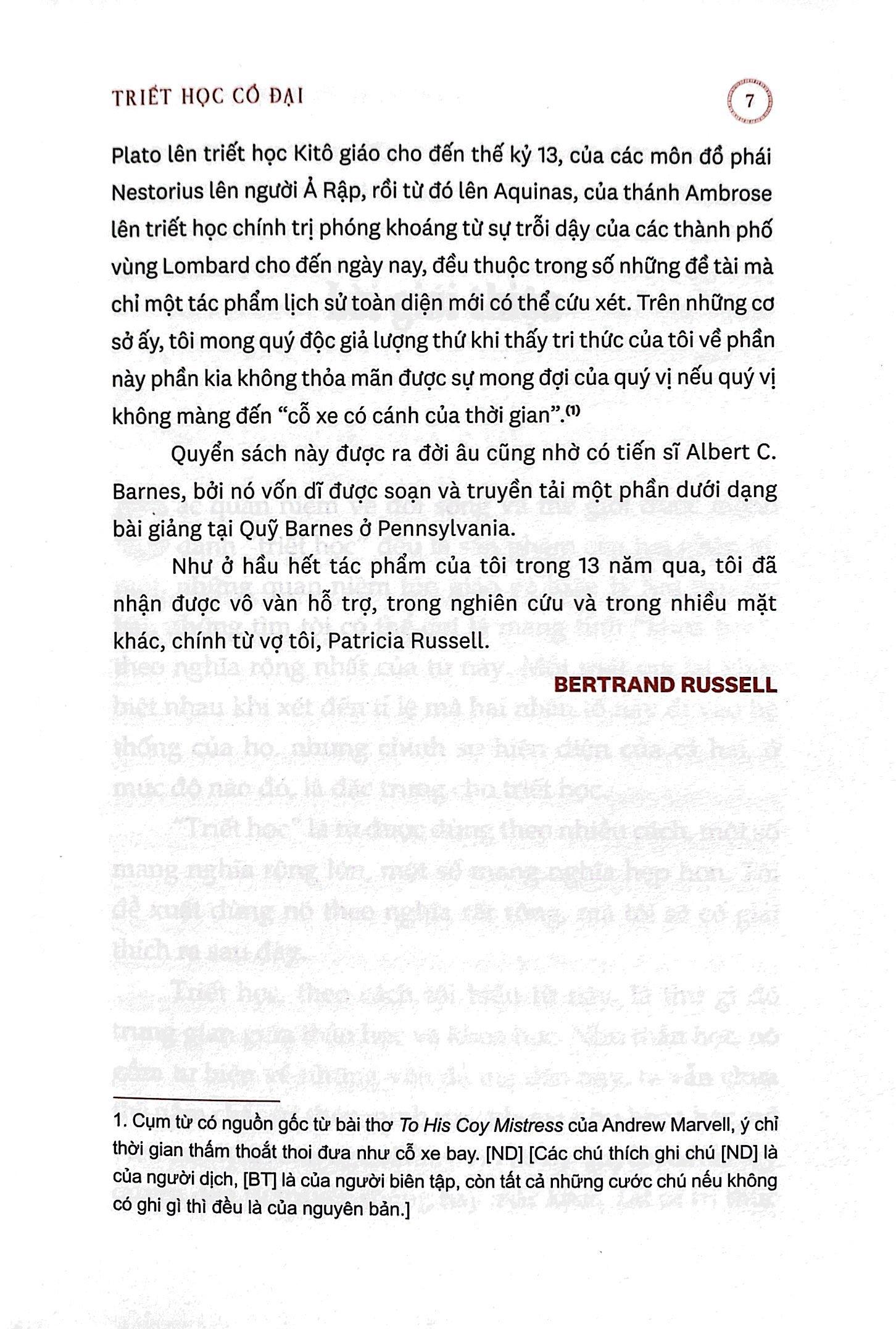 “Triết học, khác với thần học, bắt đầu ở Hy Lạp vào thế kỷ 6 TCN. Sau khi đi hết chặng đường dài trong thời cổ, nó lại bị thần học nhận chìm khi Kitô giáo trỗi dậy và La Mã tàn lụi. Giai đoạn vĩ đại thứ hai của nó từ thế kỷ 11 cho đến 14 diễn ra dưới sự thống trị của giáo hội Công giáo, ấy là trừ đi một vài kẻ nổi loạn vĩ đại, chẳng hạn hoàng đế Frederick II (1195-1250). Giai đoạn này bị đặt dấu chấm hết bởi tình cảnh hỗn loạn tựu thành cuộc Cải cách. Giai đoạn thứ ba từ thế kỷ 17 cho đến ngày nay, chịu sự thống trị, hơn cả hai quãng trước, của khoa học; những tín ngưỡng tôn giáo truyền thống vẫn còn quan trọng, nhưng người ta cảm thấy cần phải biện minh cho chúng, và chúng chịu biến cải bất cứ đâu khoa học dường như ép buộc làm vậy.”