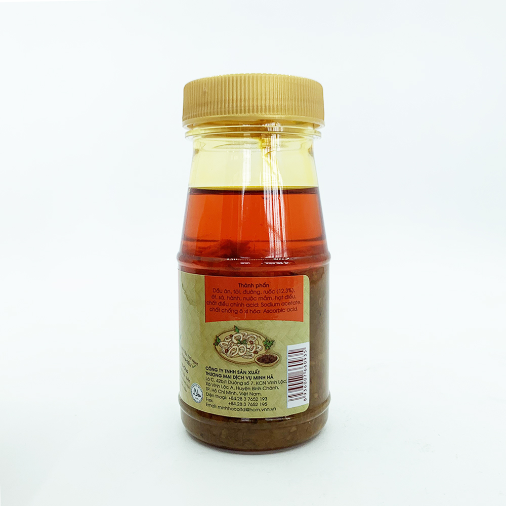 CHI TIẾT SẢN PHẨM 1. Khối lượng: 100g 2. Thành phần: Dầu ăn, ớt, nước, đường, tôm khô (10%), tỏi, sả, muối ăn,… 3. Loại chai: PET 4. Quy cách đóng gói: 72 chai/thùng 5.