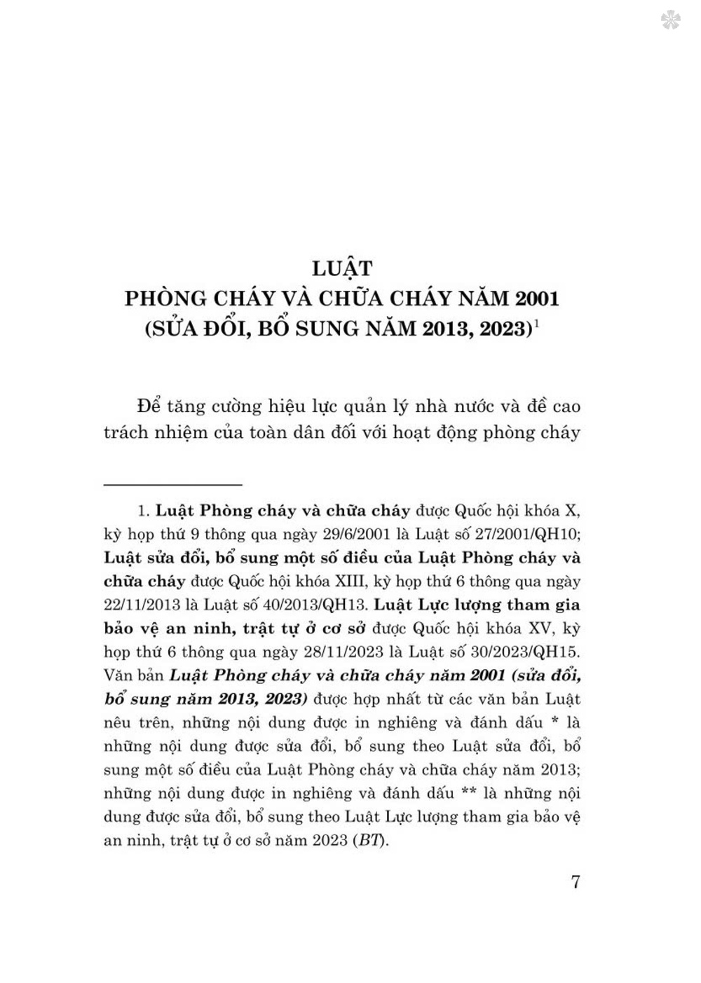 Ngày 28/11/2023, tại kỳ họp thứ 6 Quốc hội khóa XV thông qua Luật Lực lượng tham gia bảo vệ an ninh, trật tự ở cơ sở, trong đó có sửa đổi, bổ sung một số nội dung của Luật Phòng cháy và chữa cháy năm 2001 (sửa đổi, bổ sung năm 2013).