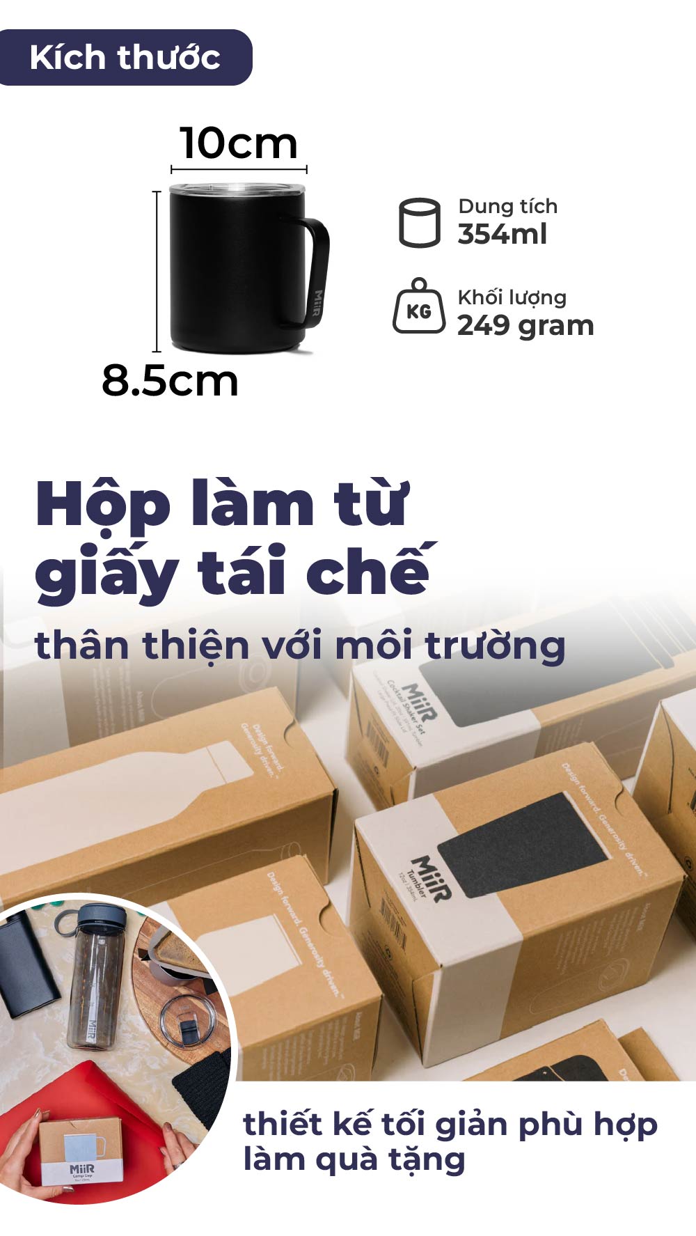 Cốc giữ nhiệt Camp Cup MiiR 354ml mang vẻ đẹp sang trọng, hoài cổ, không sợ lỗi thời theo thời gian. Thân cốc hình trụ tròn, dáng thấp cùng đường nét tối giản, đi kèm tay cầm tiện dụng và thoải mái. Thiết kế của sản phẩm luôn mang tính bền vững và có tính ứng dụng cao.