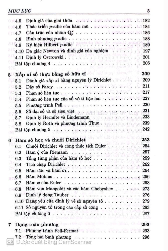 Chương 5 nghiên cứu về xấp xỉ số thực bằng các số hữu tỉ. Về tinh thần thì chương này song song với chương trước về các số p-adic nhưng nội dung cụ thể thì sẽ khác. Những nội dung kinh điển về dãy Farey, phân số liên tục và ứng dụng vào phương trình Pell được trình bày trong chương này. Trong chương này ta sẽ trình bày định lý kinh điển của Hermite và Lindemann về tính siêu việt của số e và số π. Ở mục cuối, ta sẽ đề cập đến định lý Roth và phương trình Thue.