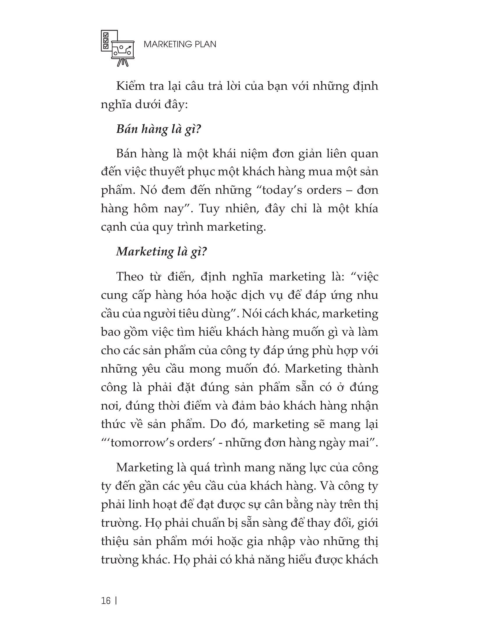 Cuốn sách “Marketing Plan – 9 bước xây dựng chiến lược thương hiệu chuyên nghiệp” đơn giản hóa nhiệm vụ phát triển kế hoạch marketing cho sản phẩm hoặc doanh nghiệp, hướng dẫn tiếp cận từng bước toàn bộ quá trình, từ thực hiện kiểm toán chi phí marketing, đặt mục tiêu và đưa ra ngân sách, đến viết và trình bày kế hoạch và cuối cùng là thực hiện kế hoạch.
