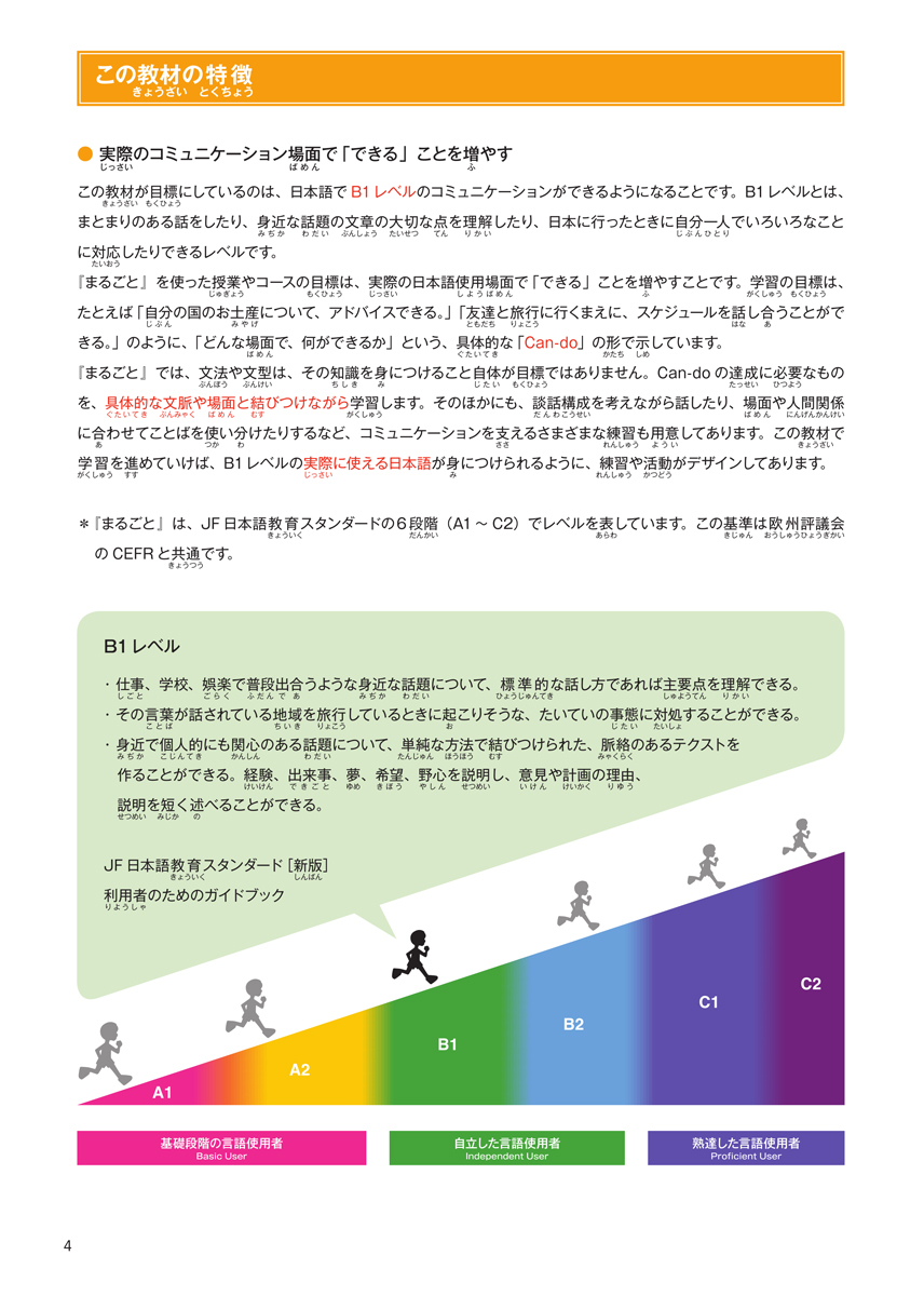 Được dày công biên soạn bởi Quỹ Giao lưu Quốc tế Nhật Bản (Japan Foundation), và triển hai theo Chuẩn giáo dục tiếng Nhật JF gồm 6 cấp độ: A1, A2 (sử dụng ngôn ngữ ở mức độ cơ bản); B1, B2 (sử dụng ngôn ngữ ở mức độ độc lập); C1, C2 (sử dụng ngôn ngữ ở mức độ thành thạo), từ lâu, “Marugoto - Ngôn ngữ và Văn hóa Nhật Bản” đã được biết đến là bộ giáo trình hoàn hảo dành cho những ai có nhu cầu học tập và sử dụng thành thạo tiếng Nhật trong các tình huống ứng xử ngoài đời sống. Tựa đề “Marugoto” trong tiếng Nhật có nghĩa là “trọn vẹn”, chứa đựng thông điệp mà những người thực hiện bộ giáo trình muốn gửi gắm: trọn vẹn trong giao tiếp, trọn vẹn trong trải nghiệm ngôn ngữ cùng đời sống và văn hóa.