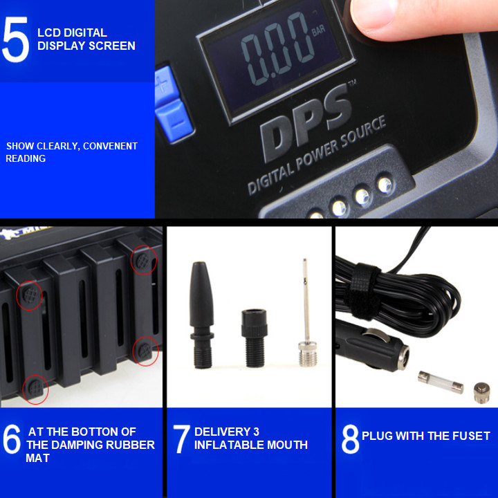 - Động cơ mạnh mẽ 180W cho áp suất tối đa 150PSI. Đèn LED 4 bóng ánh sáng trắng để soi ban đêm.