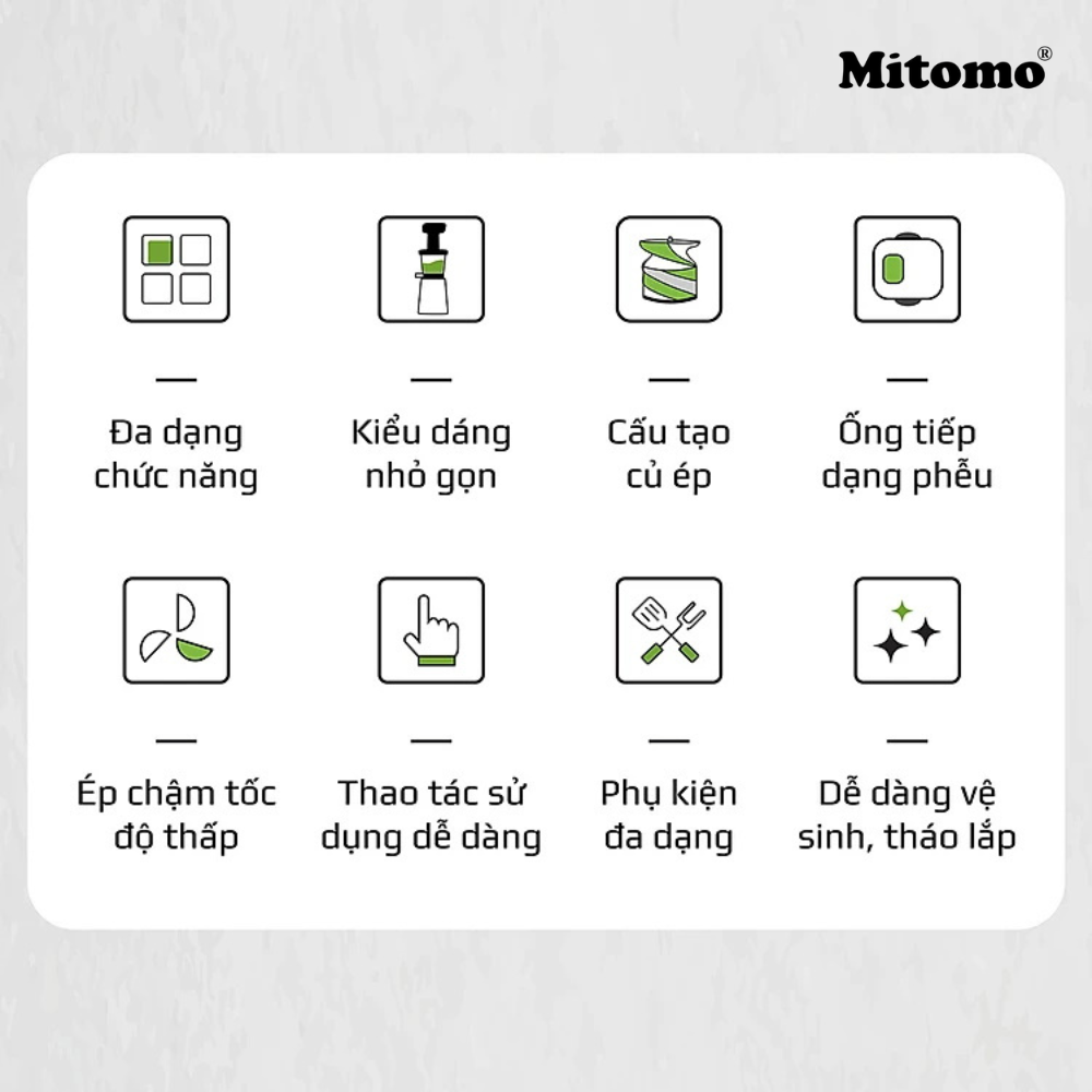 Máy ép trái ép chậm Mitomo EC-55 giúp ép siêu kiệt bã đến 95%, với thiết kế kiểu dáng máy ép trái cây vô cùng tiện dụng sang trọng và tinh tế. Máy ép chậm theo cơ chế hoàn toàn tự động, trái cây sẽ được ép chậm theo cơ chế xoắn ốc giúp ép trái cây kiệt nước tối đa lên đến 95%. Máy ép nhỏ gọn tháo lắp và vệ sinh vô cùng dễ dàng. Ngoài ra máy hoạt động rất bền bỉ và ép được các loại trái cây cứng.