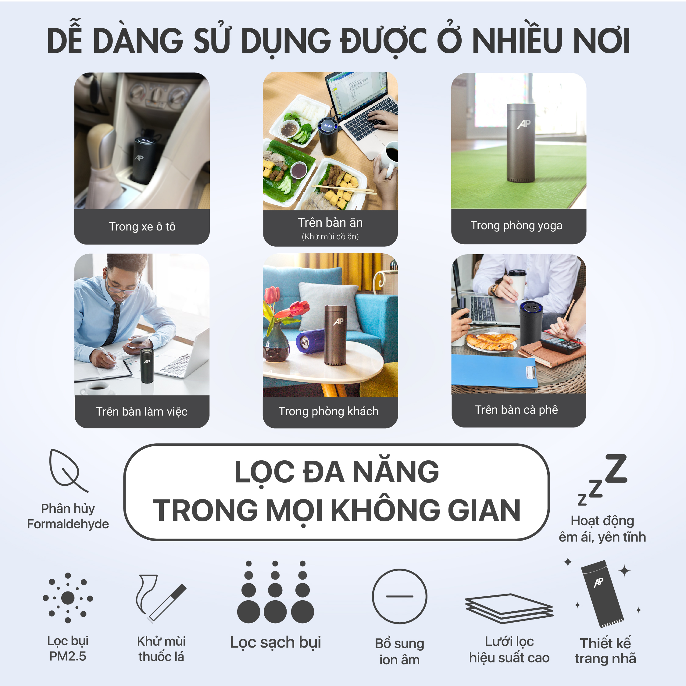 - Bộ chip vi xử lý điều khiển mọi chức năng của máy bao gồm quạt gió, bộ phát ion âm và cảm biến nhiệt độ hoạt động nhịp nhàng với chỉ một cú nhấn nút. LỌC SẠCH KHÔNG KHÍ MỌI LÚC MỌI NƠI: Máy lọc không khí cho ô tô AP có kích thước nhỏ gọn nên máy rất tiện dụng trong mọi tình huống trong cuộc sống. Máy lọc không khí cho ô tô AP không chỉ sử dụng được trong ô tô mà còn có thể sử dụng ở nhiều không gian khác như trong phòng làm việc, phòng ngủ hoặc để lọc không khí cho em bé trong nhà. LỌC SẠCH BỤI MỊN, KHÍ ĐỘC VÀ MÙI HÔI SẠCH TRƠN: Máy lọc không khí cho ô tô AP sở hữu một bộ lọc không khí hiện đại có thể lọc được hầu hết mọi vật chất bay hơi (VOCs) và bụi bẩn lớn nhỏ lơ lửng trong không khí bao gồm: