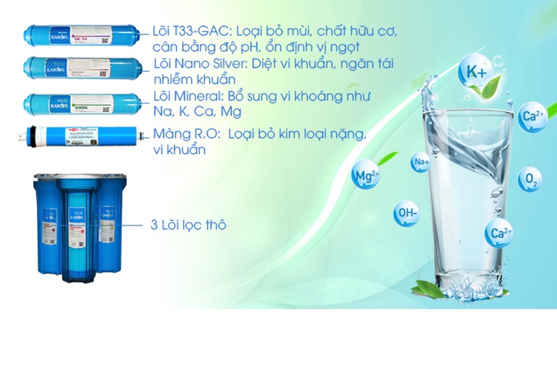 • Lõi GAC - T33: Hấp thụ các chất hữu cơ tồn dư, khử clo, làm tươi nước, tạo vị ngọt tự nhiên… Góp phần nâng PH, và tạo cảm giác trong mát khi uống.