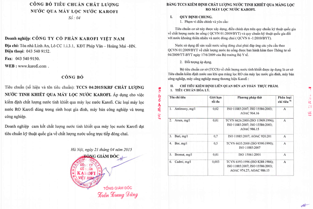 Đạt chuẩn Quốc gia nước uống trực tiếp QCVN6-1:2010/BYT Vượt qua mọi quy trình kiểm tra nghiêm ngặt về chất lượng nước sau lọc và chất lượng  dùng trong sinh hoạt gia đình, Karofi là đơn