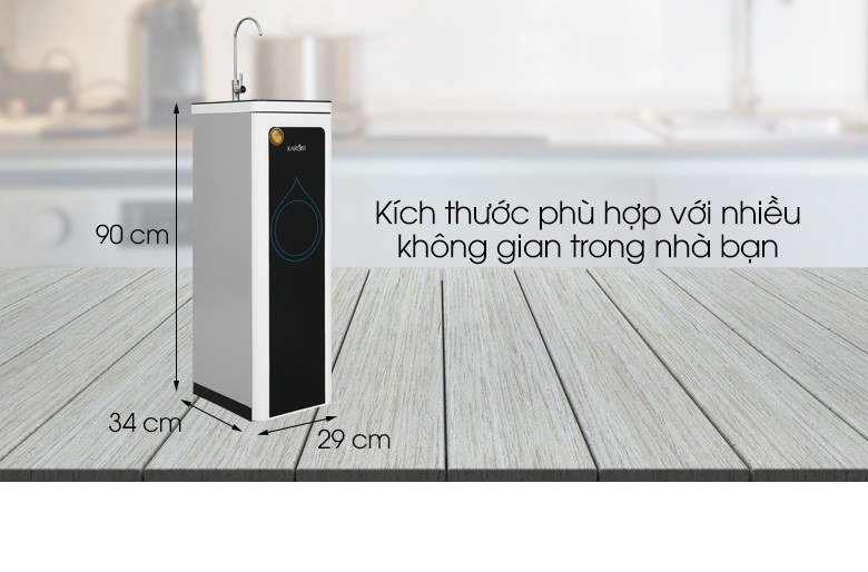 Kiểu dáng tủ đứng thon gọn tô điểm cho không gian hiện đại hơn Máy lọc nước RO Hydrogen nóng nguội 10 lõi Karofi KAH-D10 có kiểu dáng tủ đứng thon gọn, tiết kiệm diện tích