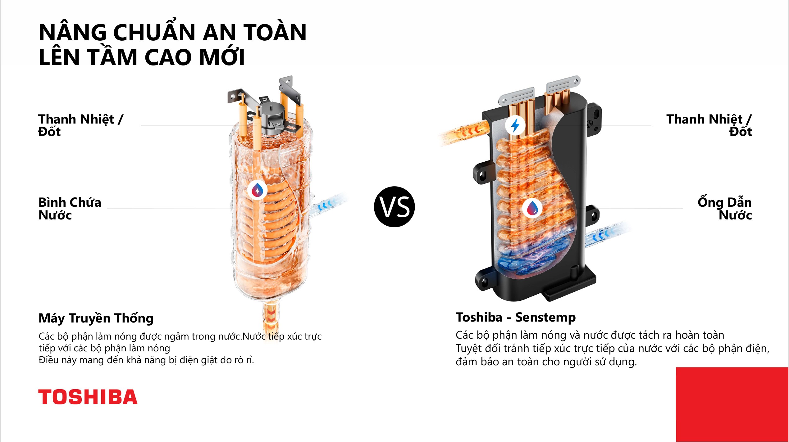 - Bảo vệ gia đình bạn với máy tắm nước nóng Toshiba. Công nghệ cảm biến và điều chỉnh nhiệt độ thông minh giúp tránh bỏng, đặc biệt an toàn cho trẻ nhỏ. Cảm biến lưu lượng & Nhiệt độ nguồn nước: Phát hiện lưu lượng dòng chảy và nhiệt độ chính xác của nguồn nước đầu vào tức thì. Thanh nhiệt tách rời nguồn nước: Tự động điều chỉnh công suất làm nóng phù hợp mới mức nhiệt độ lựa chọn. Chip xử lý thông minh - tiện lợi: Tính toán và điều khiển các hoạt động của máy một cách hợp lý và nhanh chóng. Thiết kế hiện đại chuẩn an toàn Hệ thống điện và nước tách biệt, được thiết kế các ngăn độc lập ngăn ngừa và loại bỏ các sự cố liên quan đến điện, bảo vệ người dùng tuyệt đối. Ngoài ra còn giúp thiết bị hoạt động ổn định và bền bỉ hơn.