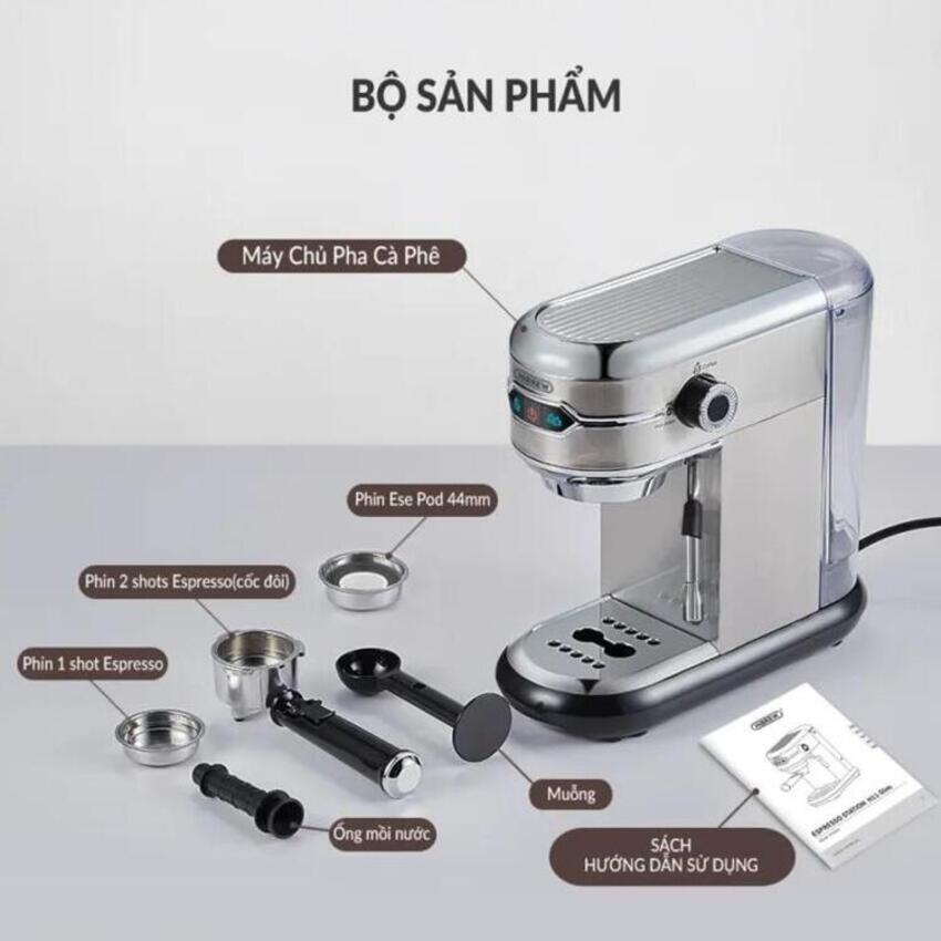 - Bộ phụ kiện bao gồm: 1 thân máy, 3 phin lọc inox, 1 tay cầm tiêu chuẩn 51mm, 1 thìa múc kiêm nén, 1 ống mồi nước, 1 sách HDSD