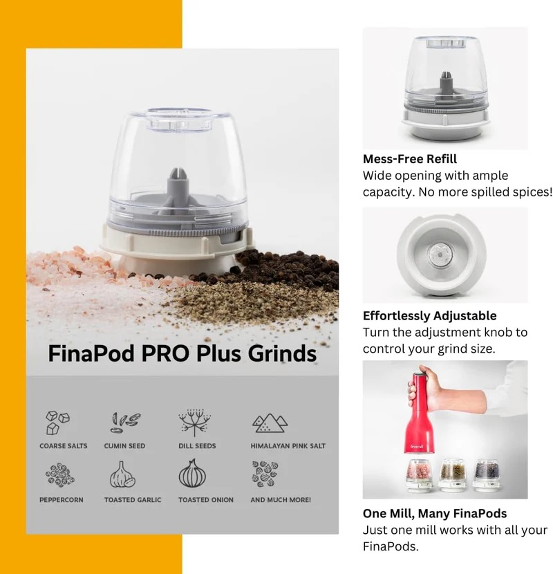 Máy xay gia vị FinaMill có cối xay riêng biệt được cấp bằng sáng chế giúp ngăn ngừa lẫn mùi vị giữa các loại gia vị. Lõi cối xay màu xám được thiết kế để xay các loại gia vị có dầu như tỏi bằm nhỏ, hạt thì là... trong khi lõi màu nâu phù hợp cho các loại gia vị cứng như hạt tiêu sọ, tiêu đen...