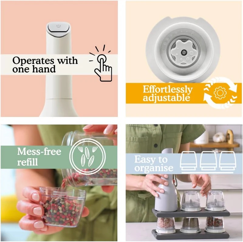 Máy xay đi kèm với tay cầm bằng nhựa có tích hợp pin sạc, hai cối xay gia vị riêng biệt, và dây sạc. Cơ chế xay bằng gốm mang đến độ bền cao và an toàn cho sức khỏe, trong khi đèn LED tích hợp giúp người dùng dễ dàng quan sát trong quá trình sử dụng.