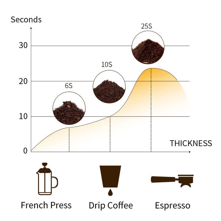 - Hướng dẫn xay: Ấn và giữ 6s đối với bột thô, 10 giây đối với bột trung bình, 25 giây đối với bột mịn. Thông số kỹ thuật sản phẩm