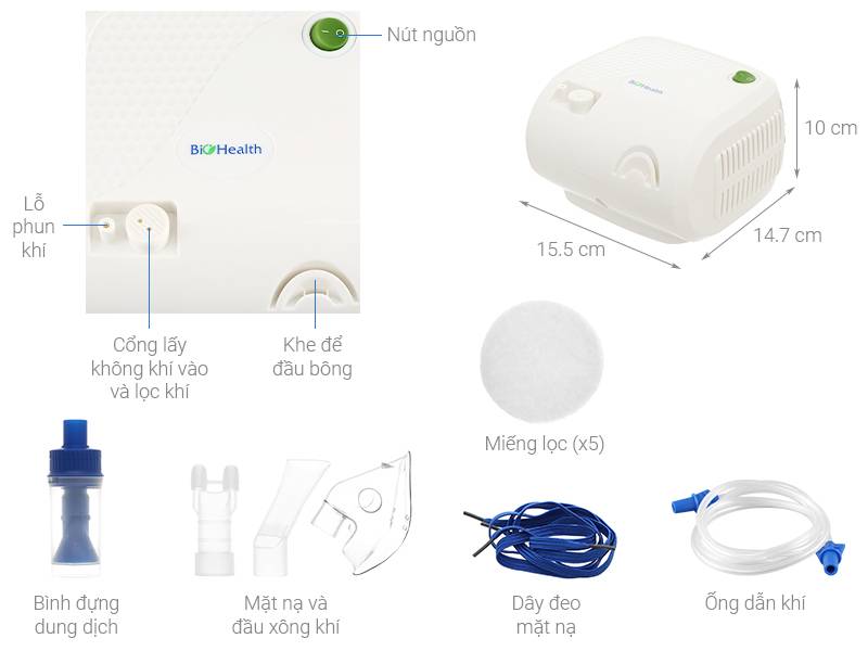 MÁY XÔNG MŨI HỌNG BIO HEALTH NEB BASIC - Máy xông mũi họng hay còn gọi là máy xông khí dung là vật dụng cần thiết để hỗ trợ khi mắc các bệnh hô hấp: hen suyễn, COPD, viêm phế quản. - Máy xông tạo ra một luồng không khí di chuyển qua một ống thông suốt đến máy phun sương. Khi không khí đi vào máy phun sương, nó sẽ chuyển đổi thuốc