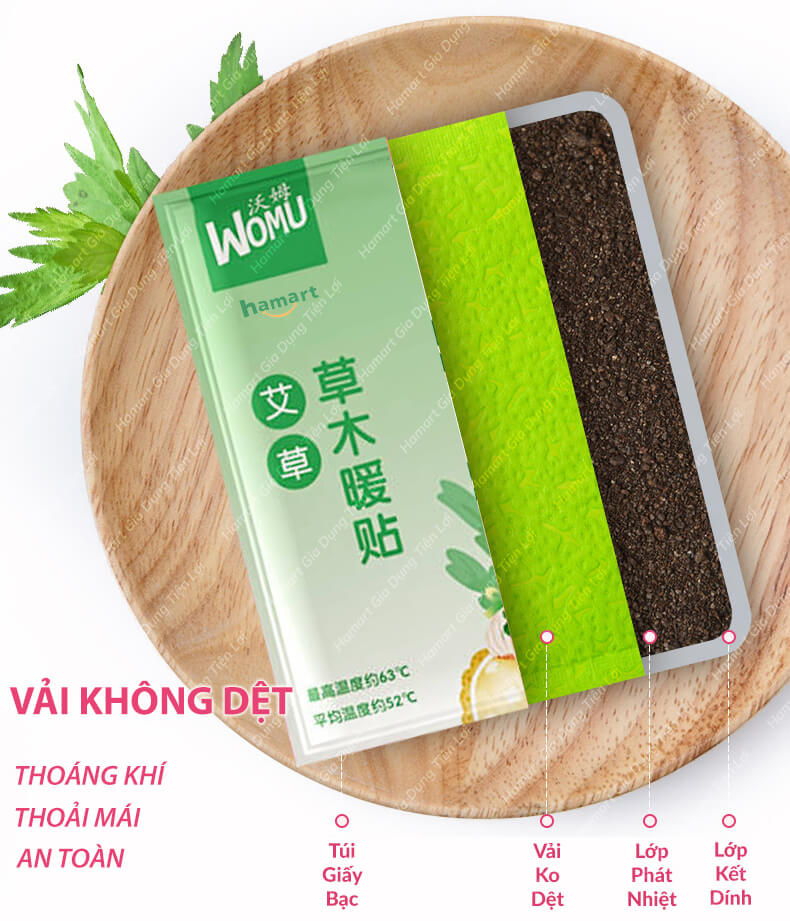 Miếng dán giữ nhiệt WOMU là miếng dán đa công năng với tác dụng của miếng dán giữ nhiệt cơ thể & Giảm đau nhức mỏi vùng cổ vai gáy (Đặc Biệt vùng bụng ngày đèn đỏ) - Sinh nhiệt bằng phản ứng sắt với oxy trong không khí và chất xúc tác là muối giúp làm ấm cơ thể, cải thiện vùng tuần hoàn, kích thích tiêu hóa, làm giảm các triệu chứng mỏi cơ, cứng cơ, đau cơ và khó chịu trong chu kỳ kinh nguyệt, đau dây thần kinh.
