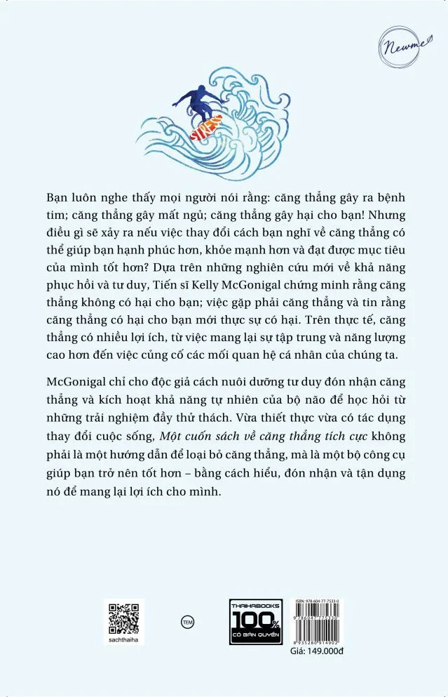Bạn luôn nghe thấy mọi người nói rằng: căng thẳng gây ra bệnh tim; căng thẳng gây mất ngủ; căng thẳng gây hại cho bạn! Nhưng điều gì sẽ xảy ra nếu việc thay đổi cách bạn nghĩ về căng thẳng có thể giúp bạn hạnh phúc hơn, khỏe mạnh hơn và đạt được mục tiêu của mình tốt hơn? Dựa trên những nghiên cứu mới về khả năng phục hồi và tư duy, Tiến sĩ Kelly McGonigal chứng minh rằng căng thẳng không có hại cho bạn; việc gặp phải căng thẳng và tin rằng căng thẳng có hại cho bạn mới thực sự có hại. Trên thực tế, căng thẳng có nhiều lợi ích, từ việc mang lại sự tập trung và năng lượng cao hơn đến việc củng cố các mối quan hệ cá nhân của chúng ta. McGonigal chỉ cho độc giả cách nuôi dưỡng tư duy đón nhận căng thẳng và kích hoạt khả năng tự nhiên của bộ não để học hỏi từ những trải nghiệm đầy thử thách. Vừa thiết thực vừa có tác dụng thay đổi cuộc sống, Một cuốn sách về căng thẳng tích cực không phải là một hướng dẫn để loại bỏ căng thẳng, mà là một bộ công cụ giúp bạn trở nên tốt hơn – bằng cách hiểu, đón nhận và tận dụng nó để mang lại lợi ích cho mình.