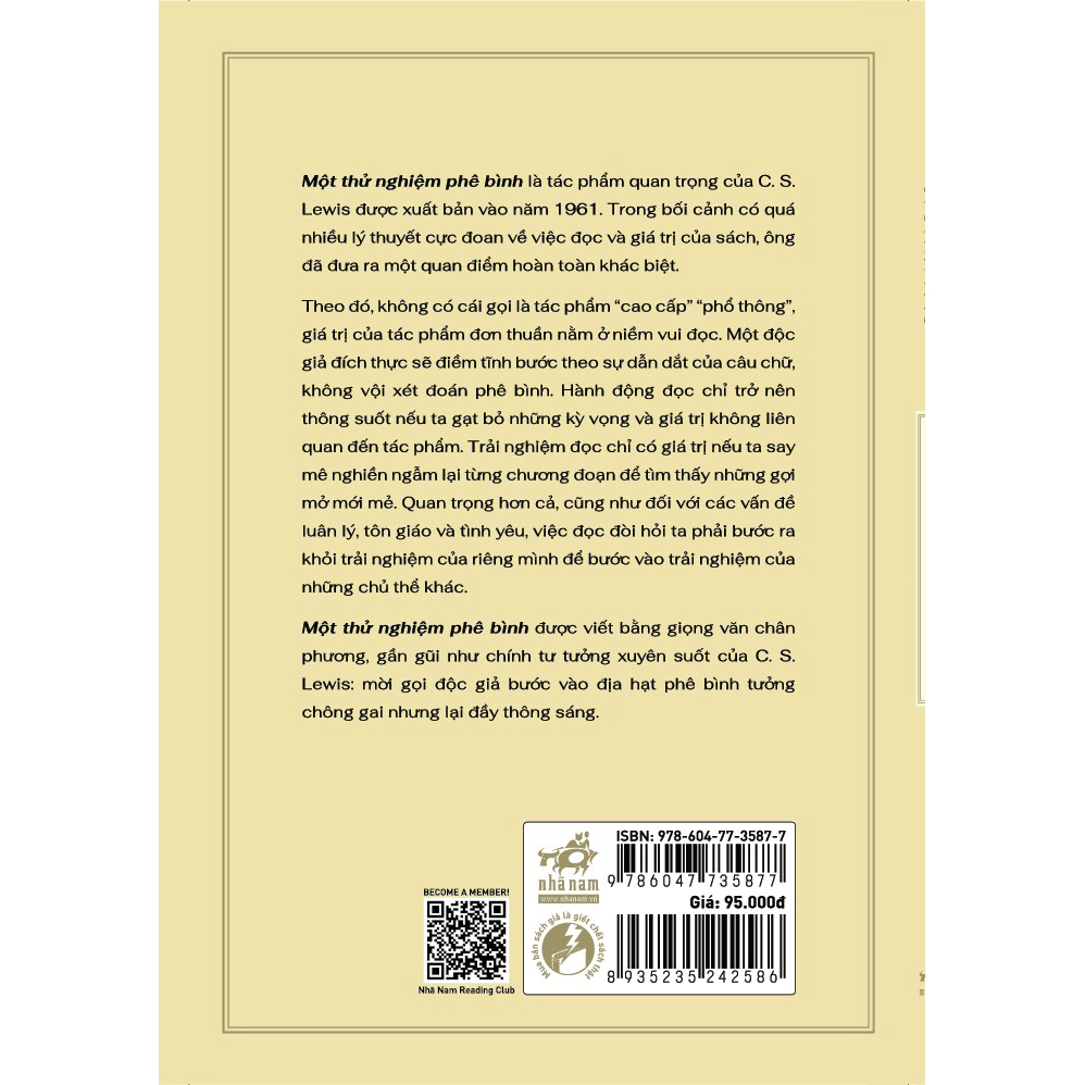 Một thử nghiệm phê bình được viết bằng giọng văn chân phương, gần gũi như chính tư tưởng của xuyên suốt của C. S. Lewis: mời gọi độc giả đến với địa hạt phê bình tưởng chông gai nhưng lại đầy thông sáng.