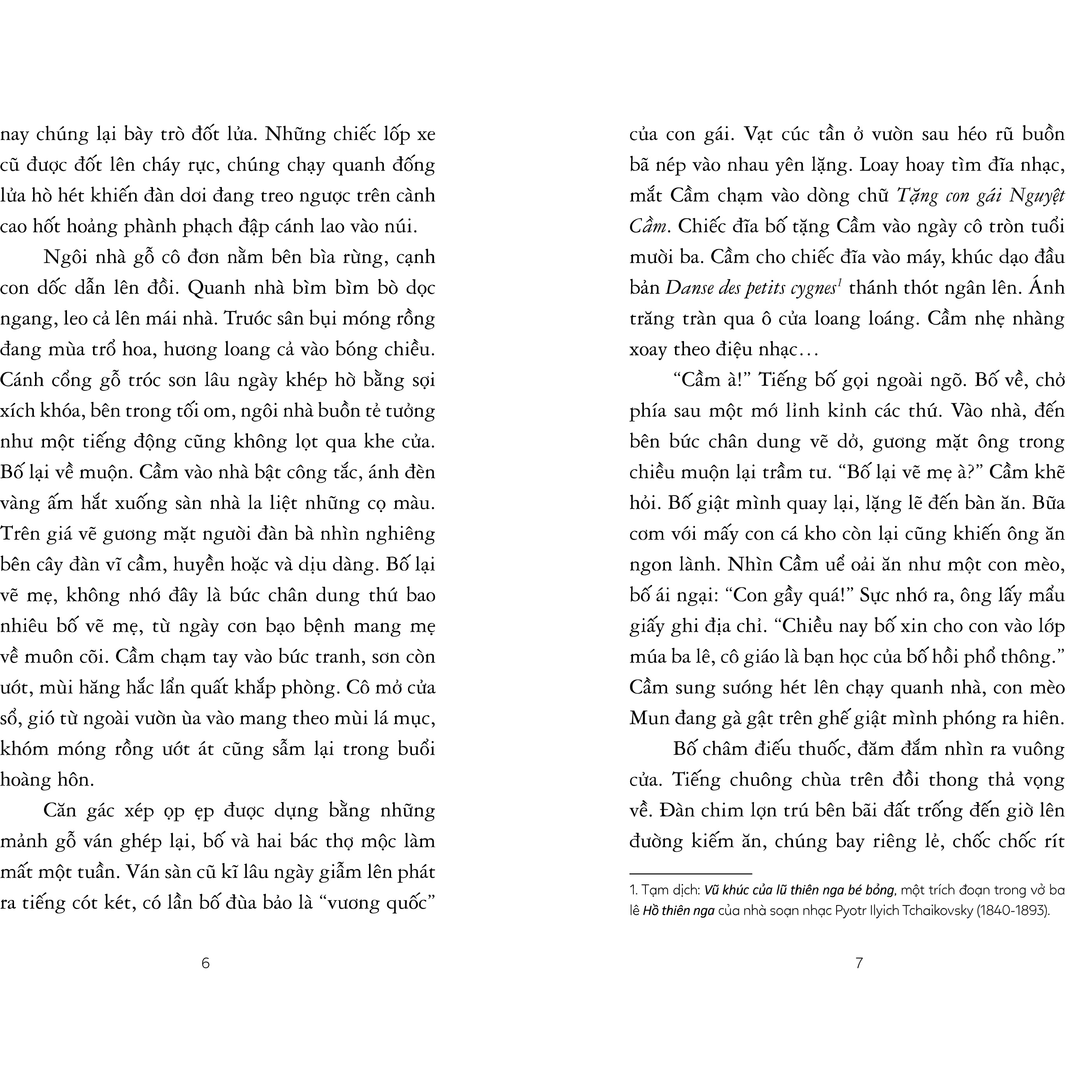 “Ngoài kia dông đã tan, trăng lạnh như sương đổ tràn xuống con đường bàng bạc. Con bé ngồi đó bất động với đôi mắt ráo hoảnh sáng như hai vì sao, thân hình còm cõi cong lại như một vệt lõm vào đêm. Những đứa trẻ cô độc đều có một thế giới của riêng mình, càng lớn nó càng lặn sâu trong thế giới đó…”