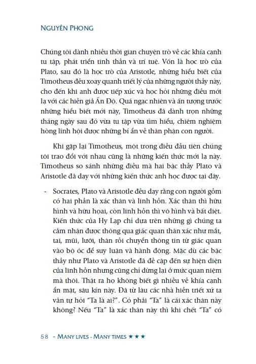 Vẫn bằng giọng văn giản dị và chừng mực, tác giả Nguyên Phong một lần nữa đưa độc giả đi qua các kiếp sống khác nhau, từ Hy Lạp, La Mã, đến Pháp thời trung cổ, rồi quay về nước Mỹ hiện đại. Ở đó, ta được trải nghiệm những hoàn cảnh khác nhau, đồng cảm với nỗi đau của nhân vật và chứng kiến sự trưởng thành của trí tuệ, để lần nữa khẳng định được rằng chính ý nghĩ, lời nói và hành động của chúng ta ở kiếp này sẽ dẫn dắt chúng ta đi về đâu ở kiếp sau. Chẳng có thần linh hay thế lực nào quyết định, chúng ta hoàn toàn chịu trách nhiệm về cuộc đời mình.