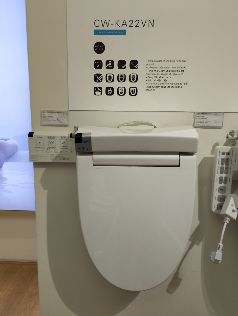 - TÍNH NĂNG SẢN PHẨM: + Nắp Shower Toilet CW-KA22AVN có thể kết hợp với tất cả các bàn cầu một khối và hai khối thương hiệu INAX và tương đương của các hãng khác. + E-Clean: Phun rửa tự động trước sau + Nước cấp: Nối trực tiếp từ đường ống nước + EvaClean: Vệ sinh phụ nữ + CozyCare: Sưởi ấm bệ ngồi + X-Fresh: Khử mùi nhanh + EcoPower: TIết kiệm điện + Công nghệ Hyperkilamic kháng khuẩn độc quyền của INAX Nhật Bản. + Nắp điện tử CW-KA22AVN đóng êm. + Có bảng điều khiển cầm tay.