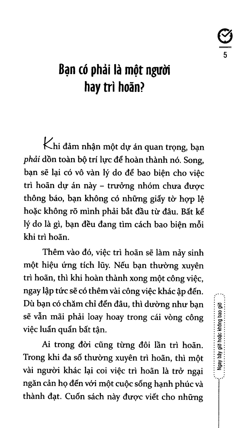 Thành công chỉ thực sự đến khi bạn giữ một lòng kiên trì sắt đá với những mục tiêu đã được đặt ra. Trong cuốn sách này, J. S. Scott đã cung cấp chi tiết những kế hoạch hành động trên mọi lĩnh vực của cuộc sống hằng ngày: từ chăm sóc sức khỏe, thể dục, công việc cho tới các mối quan hệ cá nhân. Không giống như các cuốn sách rèn luyện kỹ năng tầm thường khác, nội dung cuốn sách tập trung tối đa vào hai chữ “hành động”. Vì vậy, thay vì phải đọc những lời khuyên chung chung, bạn sẽ nhận được những phương pháp có thể được thực hiện ngay lập tức nhằm tạo lập những thói quen có thể đánh bại sự trì hoãn .