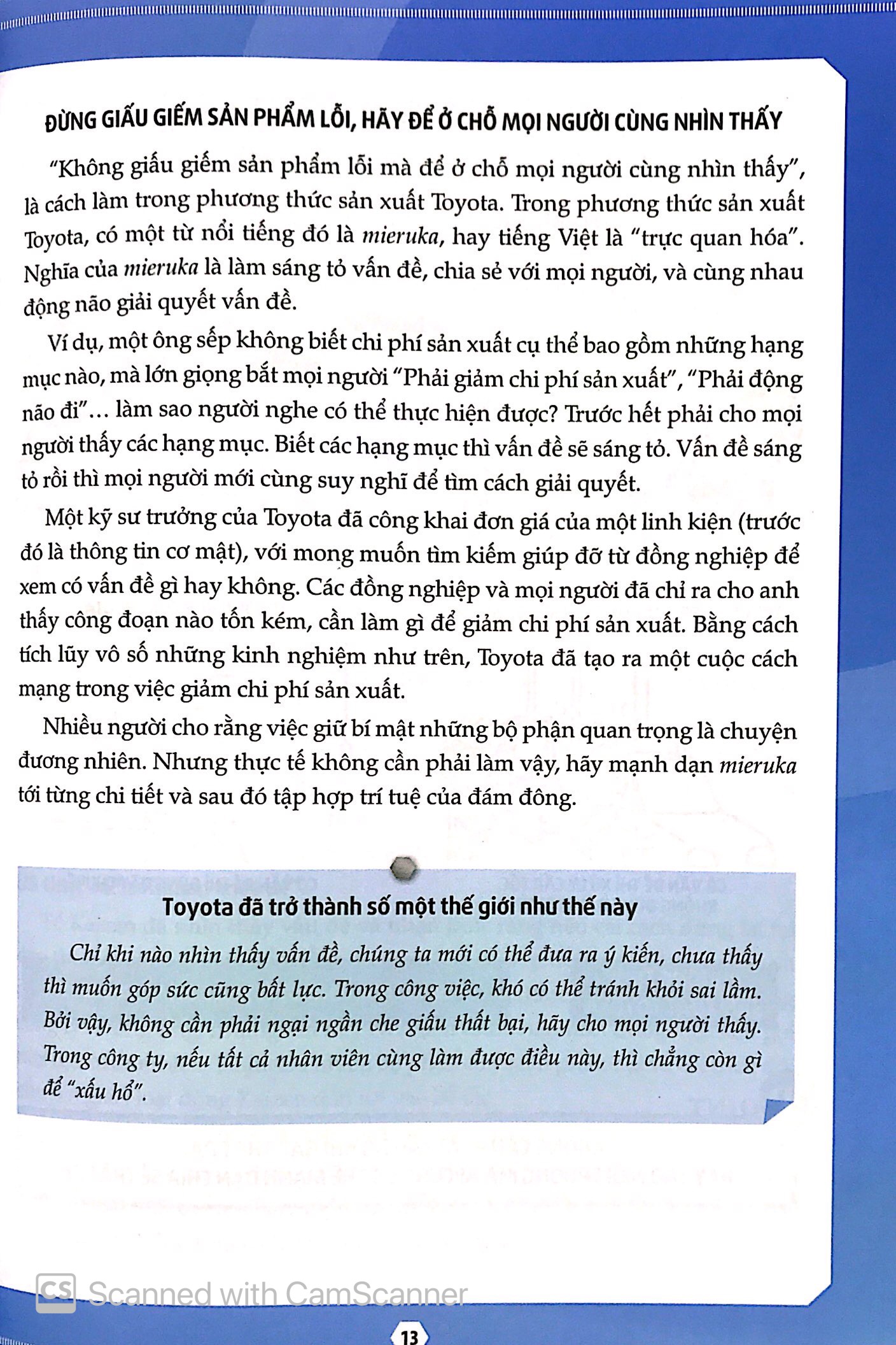 Kết quả chính là cuộc hồi phục ngoạn mục và danh hiệu nhà sản xuất xe hơi đầu tiên trên thế giới đạt đến mức sản xuất 10 triệu chiếc xe.Trong cuốn sách này, tôi đã chọn lọc ra những tinh hoa của phương thức sản xuất Toyota, cơ sở cho cuộc khôi phục ngoạn mục từ cơn khủng hoảng kinh tế Lehman, sao cho không chỉ các doanh nghiệp sản xuất mà cả phía thương mại cũng có thể áp dụng ngay lập tức (ngoài ra còn kèm theo hình minh họa sao cho dễ hiểu nhất). Bất cứ bài học nào trong cuốn sách này cũng đều được đúc rút từ những kinh nghiệm thực tế đã từng phát sinh trong công xưởng của Toyota. Có lẽ những bài học này cũng có phần "nghiêm khắc" nhưng lý do của sự “nghiêm khắc” ấy chính là xuất phát từ lòng tin vào khả năng tuyệt vời của con người. Tôi cũng mong muốn quý độc giả nhận ra và tin vào trí tuệ, khả năng tuyệt vời tiềm ẩn bên trong bản thân mình. Đồng thời, xin hãy áp dụng dù chỉ 1 hay 2 điều học được vào công việc thực tế hàng ngày. Phương thức Toyota không phải chỉ để đọc mà cần thiết phải được thực hành.